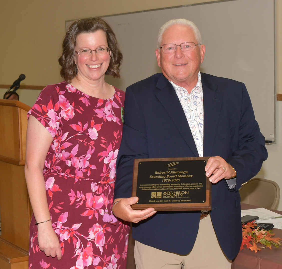 Monica Bailey presented a Founding Board Member award to retiring board member Bob Alldredge, sharing about his role in the formation and history of the organization, his service as ACDC’s sole treasurer for the entirety of its existence, and his abiding commitment to the betterment of Atchison County. Bailey, the board, and attendees conveyed gratitude and appreciation for Bob’s 47 years of tireless, dedicated service to ACDC.