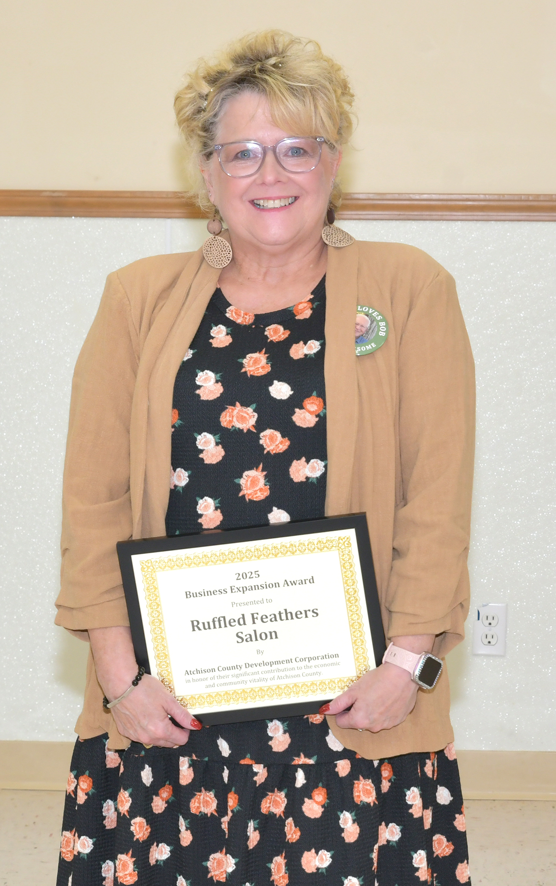 Board member Mary Ann Hull presented two Business Expansion Awards. Ruffled Feathers Salon, owned by Julie Koop Stanton in Fairfax, opened a second location this year on the Tarkio Tech campus. White Tee’s, owned by Melissa White in Tarkio, moved to a bigger location and added an embroidery machine to diversify her product line.