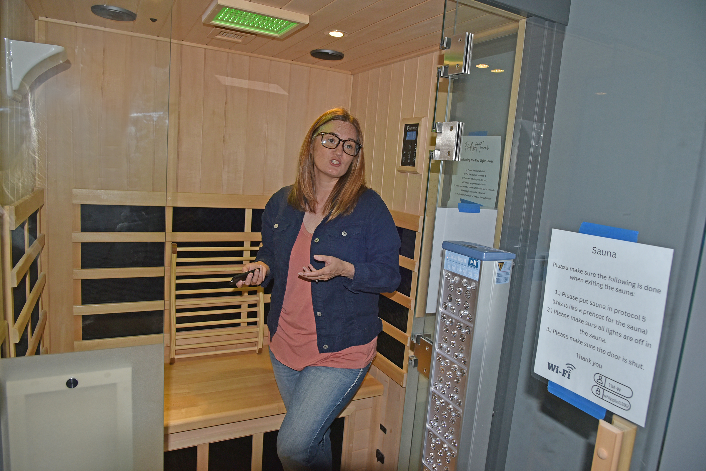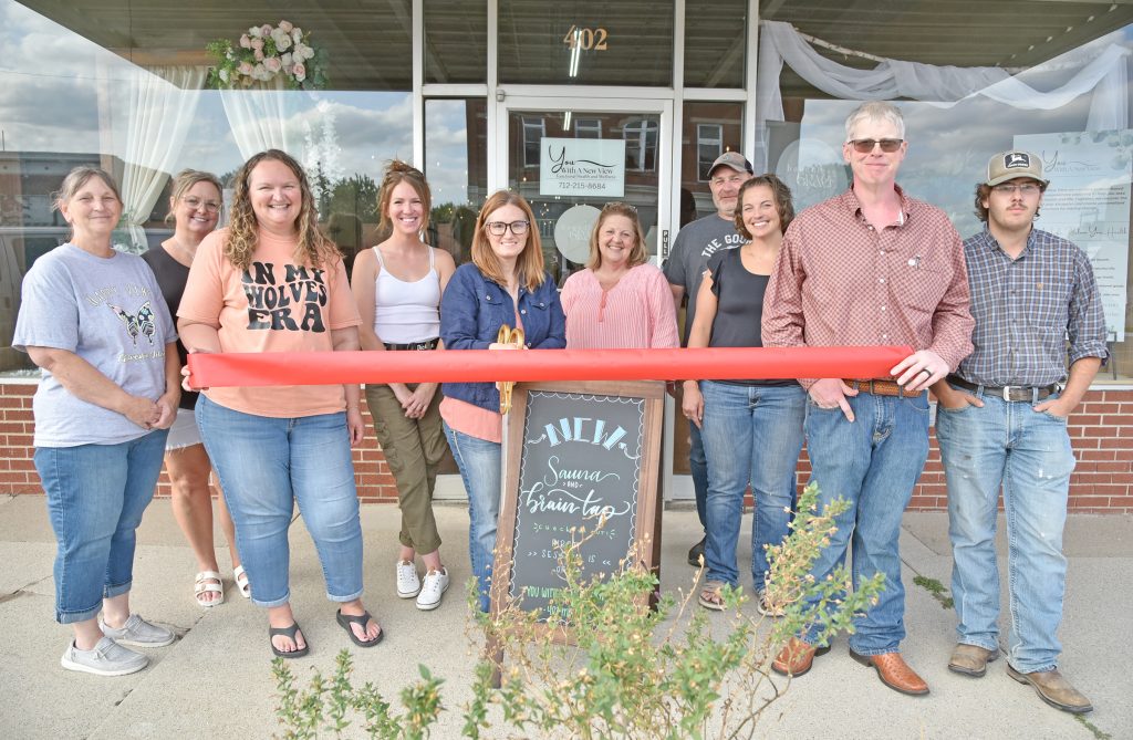 The Tarkio Chamber of Commerce held a ribbon cutting on Tuesday, September 9, 2025, to coincide with the open house at You With A New View. Located at 402 Main Street in Tarkio inside the Boundless Grace building, You With A New View offers a unique wellness experience that includes infrared sauna sessions with integrated salt therapy and red light, helping to ease joint pain, reduce inflammation, support detoxification, and improve skin health. Guests can also enjoy BrainTap guided neurotechnology sessions, which promote deep relaxation, mental clarity, better sleep, and a balanced nervous system. Functional health consultations and personalized coaching are available as well, making this a destination for anyone ready to feel better, think clearer, and take control of their health – naturally. Pictured above cutting the ribbon is You With A New View owner Mandy Whipple, her husband, Trevor, and son, Nathaniel Johnson. Others pictured include: front row – Tarkio Chamber member Melissa White; and back row – Connie Gebhards, Jennifer Lesher, Boundless Grace members Cassie Shaw and Jami DeRosier, and Donovan and Dara Spears. At right, Mandy Whipple explains all the benefits of using the sauna, salt therapy, and red light therapy. For more information, visit You With A New View’s Facebook page or call 712-215-8684.