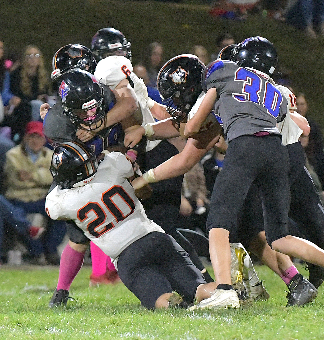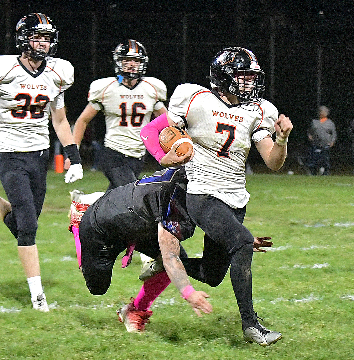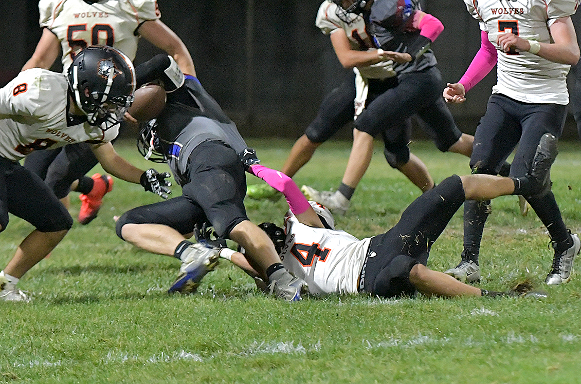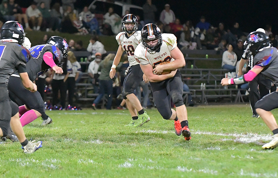 Tate Johnson protects the ball as he runs it 34 yards to find the endzone, putting more points on the board for the Wolves and taking the lead over Platte Valley.