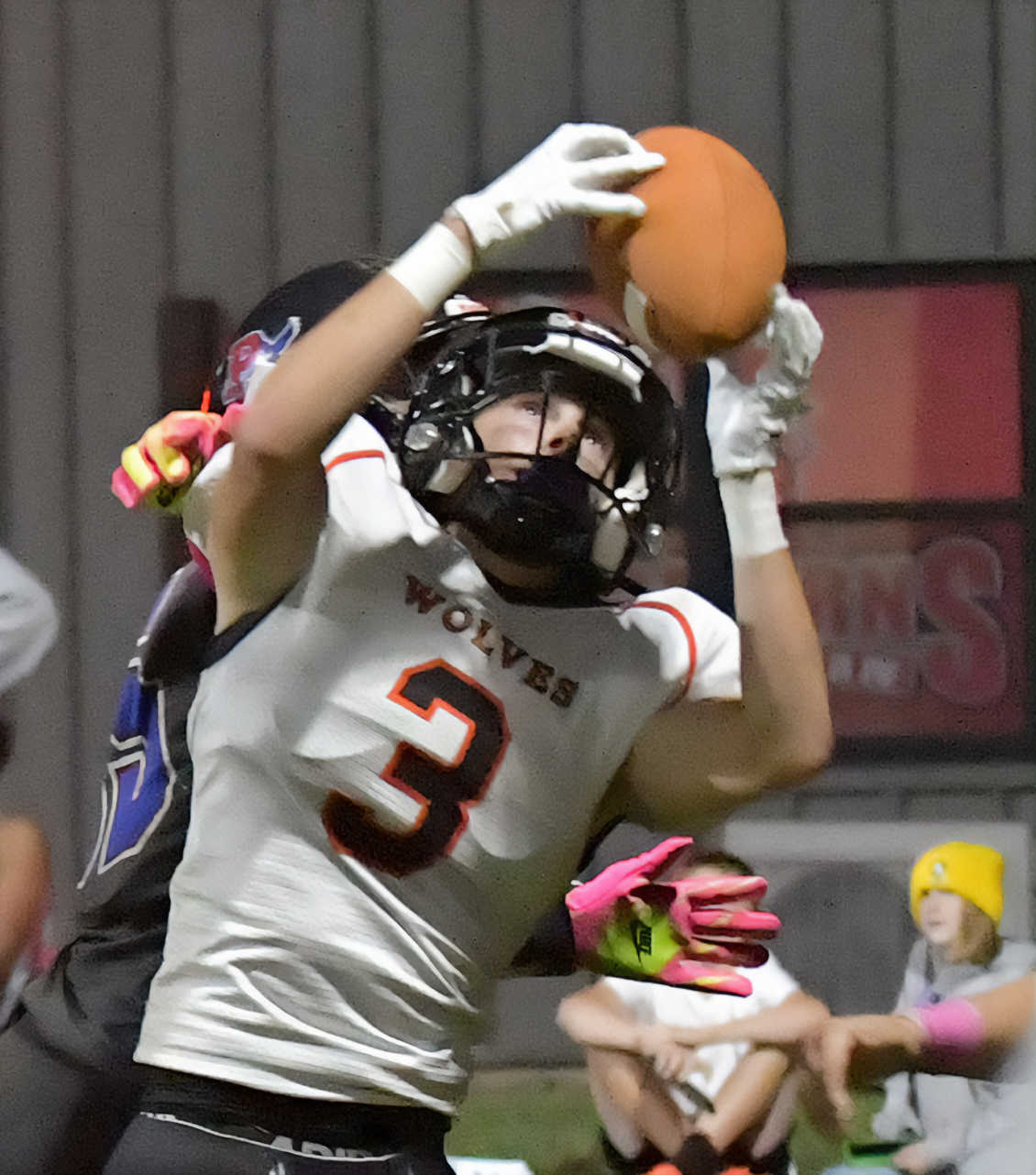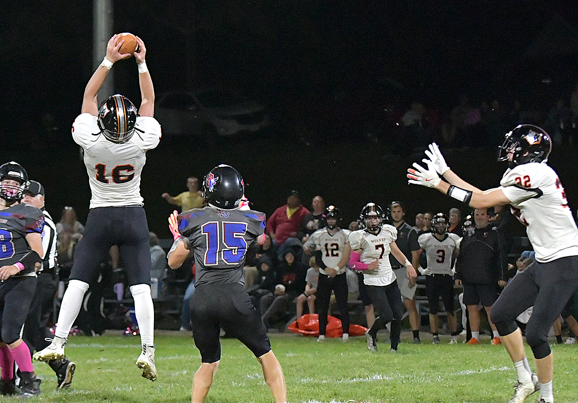 Parker Livengood uses his fingertips to bring in the ball for the catch. He scored two touchdowns in the Wolves’ win.