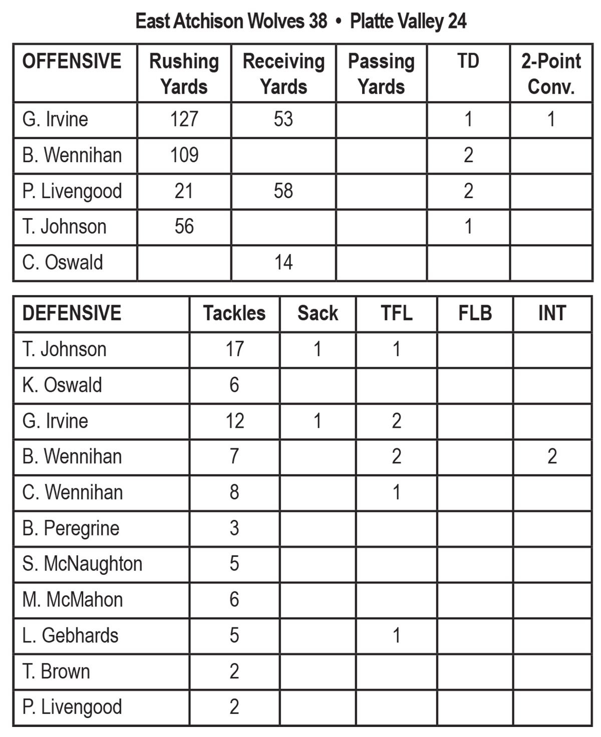 To start the second half, EA received the ball and started on their own 4-yard line. Wennihan would hit Irvine on a screen pass that set up the next touchdown, moving the ball to the 24-yard line. Wennihan would take the snap with seconds to spare to punch the ball in, tying the game at 18-18. Platte Valley answered back to take the lead once again, 24-18. The Wolves defense came up with a big stop inside the 10-yard line with a Wennihan interception, but despite moving the ball the length of the field, Platte Valley would return the favor and intercept the Wolves’ ball at the goal line. In the fourth quarter, the Wolves’ fullback Tate Johnson would go 34 yards to find the endzone with 10:50 left on the clock. With the game tied 24-24, Wennihan found Livengood on another seam route to give the Wolves their first lead of the night with 4:24 left to play, making the score 30-24. The Wolves’ defense, who played well all night, would come up big again in the fourth quarter, recovering a fumble. With 3:48 remaining in the game and deep in their own territory, EA drove the ball down the field and on a quarterback keeper Wennihan added the final touchdown of the night. It was capped off with Johnson’s 2-point conversion, bringing the score to 38-24.