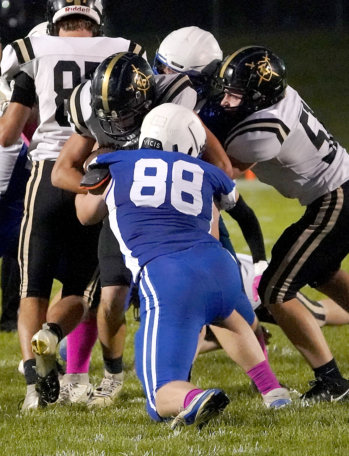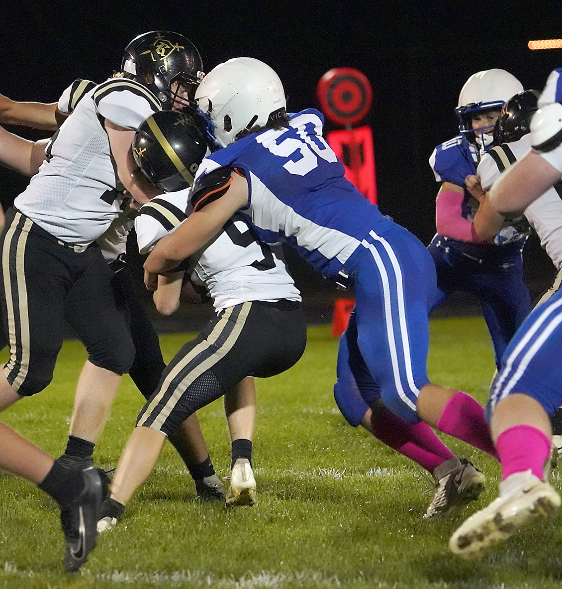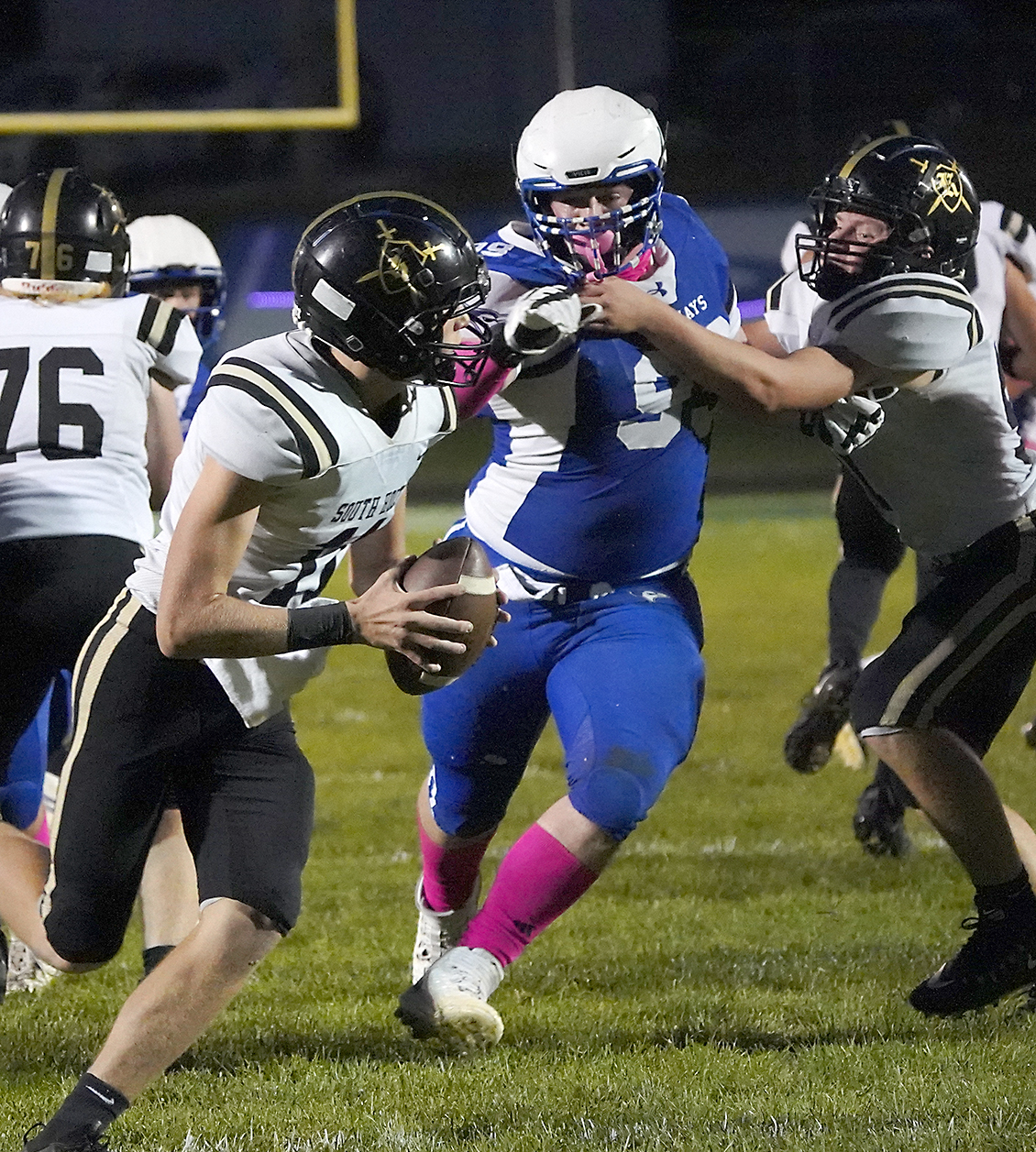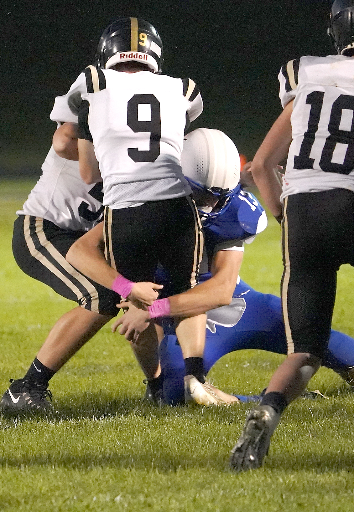 Ryder Herron fights through a hold in pursuit of the Knights’ quarterback.