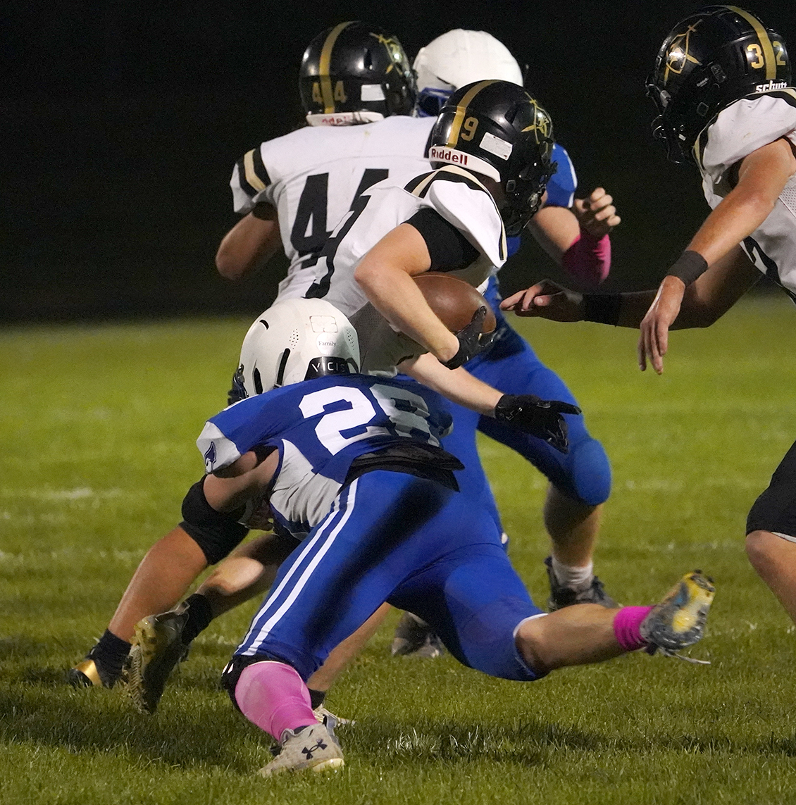 Camden McEnaney shoots in hard and wraps up for the tackle and loss of yards.