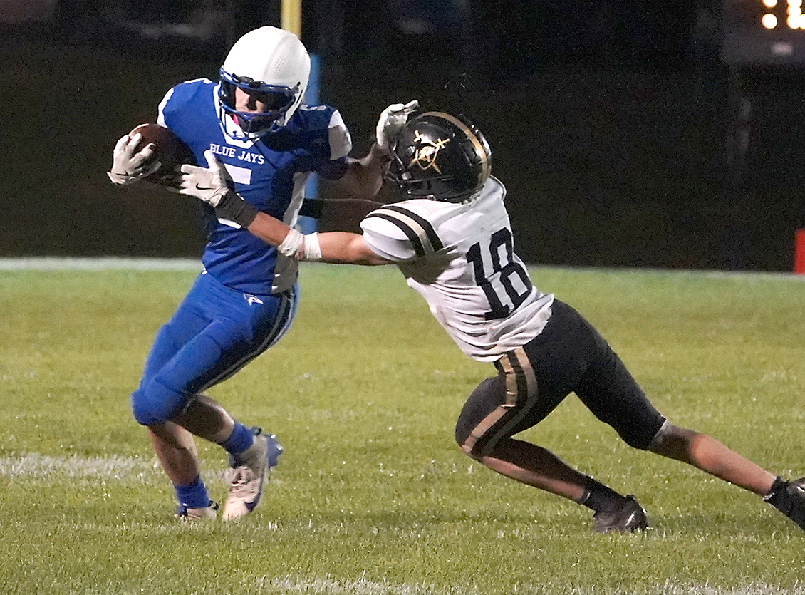 Brock Holmes would get things going with a 55-yard run on the first play of the game, followed by two touchdowns by Jack Meyerkorth. Meyerkorth’s first touchdown came from a 40-yard pass from Westyn Amthor. Jack then returned the Knight’s punt for a touchdown. The Jays’ defense would force another punt that gave the Blue Jays great field position inside their own territory. Holmes took Amthor’s hand-off down to the 8-yard line before punching it in on the next play. Once again, the Jays’ defense didn’t allow a first down, forcing the Knights to punt. With Meyerkorth back on the 30-yard line, he would field the ball and take it 50 yards for his third touchdown of the night, bringing the score to 40-0. In the next defensive series, Brock Holmes intercepted the ball, taking it back to the 17-yard line. Quarterback Jack Meyerkorth would take the ball up the middle for his final touchdown of the night. This brought the score to 48-0 with all 2-point conversions being good.