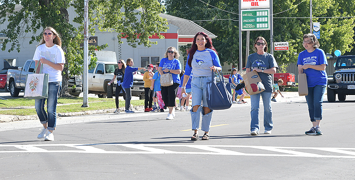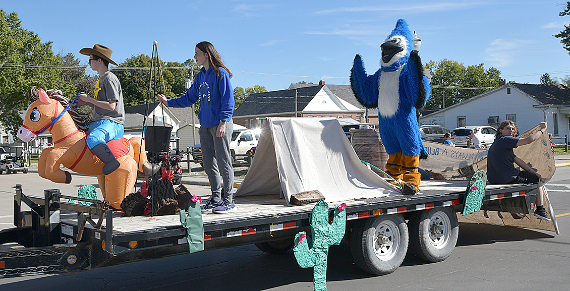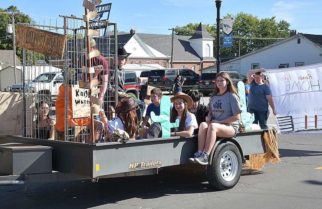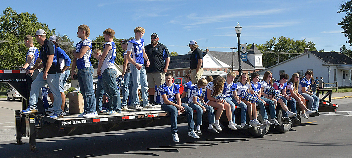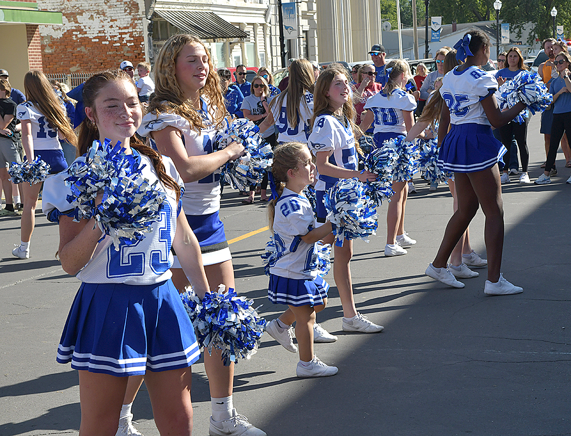 The Rock Port football players and the cheerleaders bring up the end of the parade.