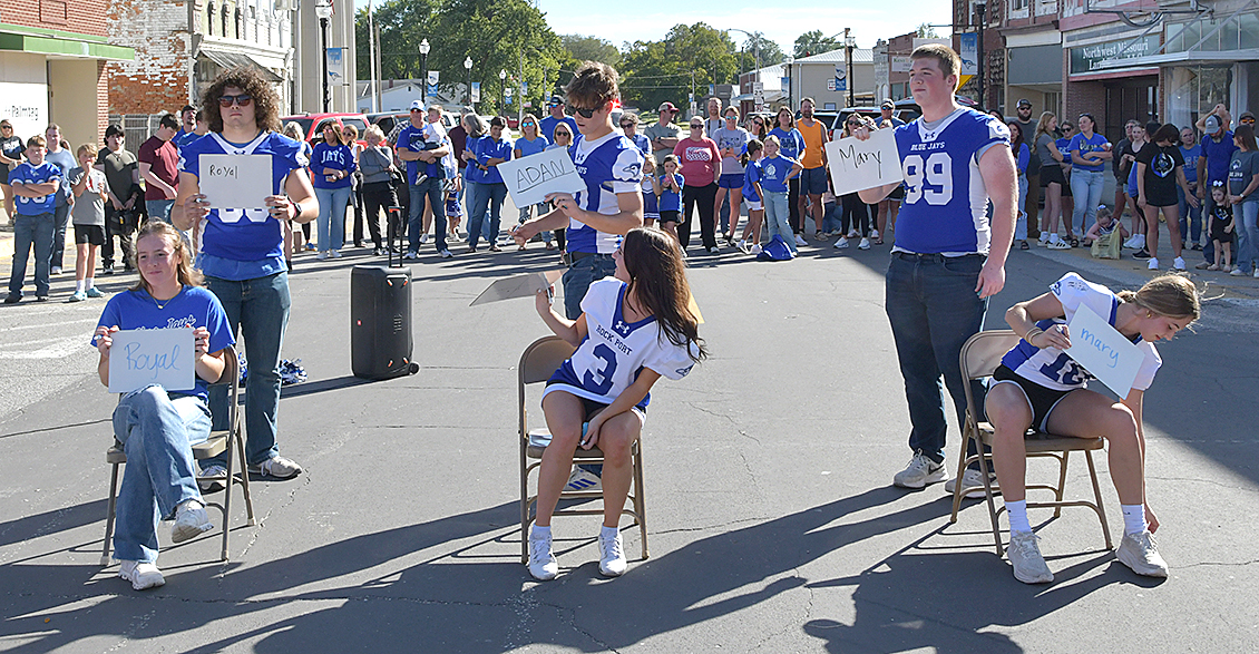 Members of the 2025 Rock Port High School Homecoming Court, from left to right, are: front row – Sophie Smith and Ray Herron, crownbearers; and back row – Bertie Meyerkorth and Jagger Jones, sixth grade attendants; Aleyda Clodfelter and Briar Daugherty, eighth grade attendants; Karlie Gebhards and Jaxson Smith, sophomore attendants; Jacoby Driskell and Emma Teten, queen candidates; Queen Ella Meyerkorth and King Ryder Herron; Quentin Jackson and Tayden Cook, king candidates; Audrey Dougherty and Gabe Gebhards, junior attendants; Anna Weber and Colt Seiter, freshman attendants; and Nella Steuter and Jack Bailey, seventh grade attendants.