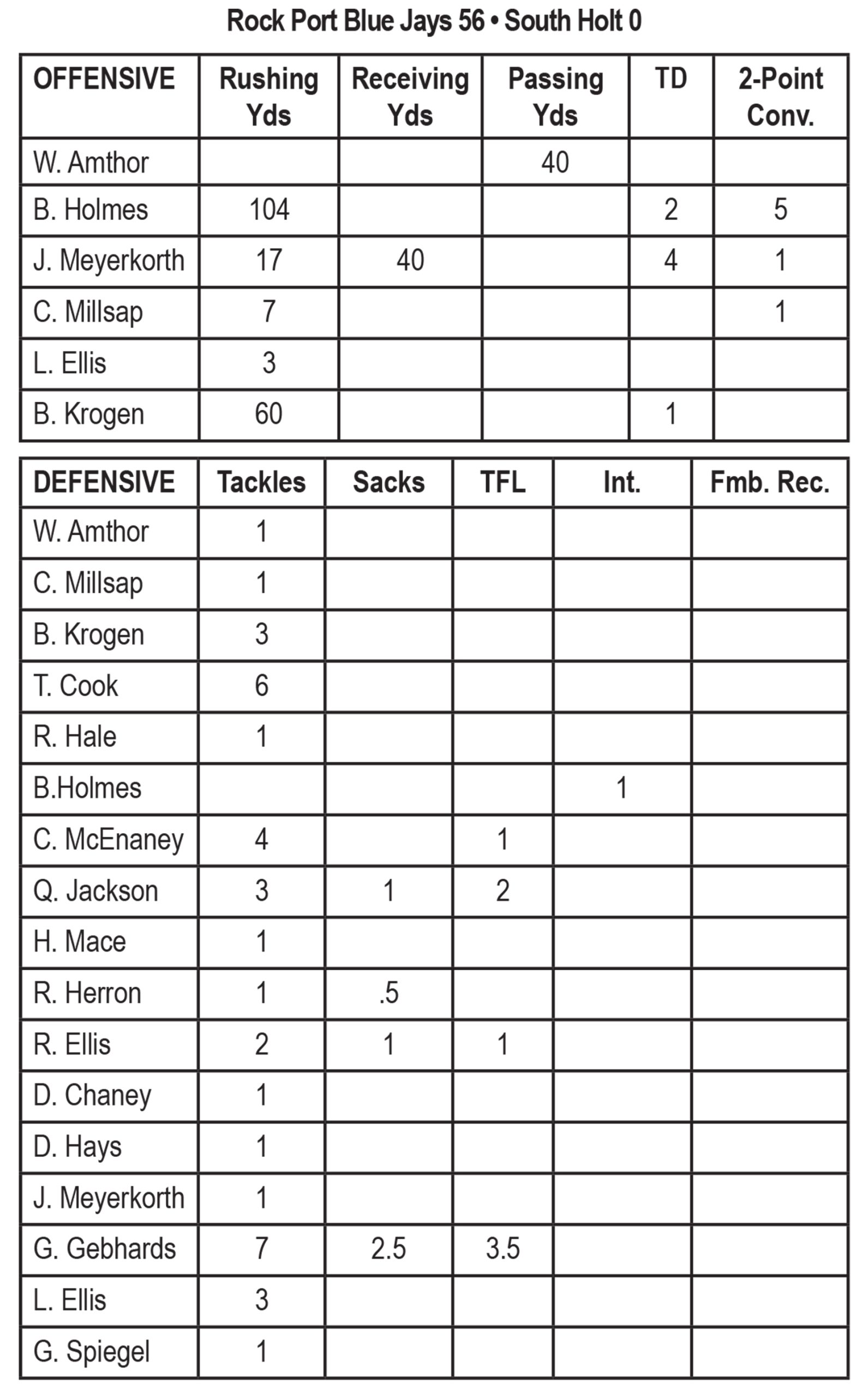 In the second quarter, Rock Port started to get some of the second-string backfield in the game with Logan Ellis, Case Millsap and Blaise Krogen. The Jays were able to move the ball to the 18-yard line before Blaise Krogen would go up the middle to add the final score of the game. Defensively, the Jays held the Knights to only one first down on the night and no points.