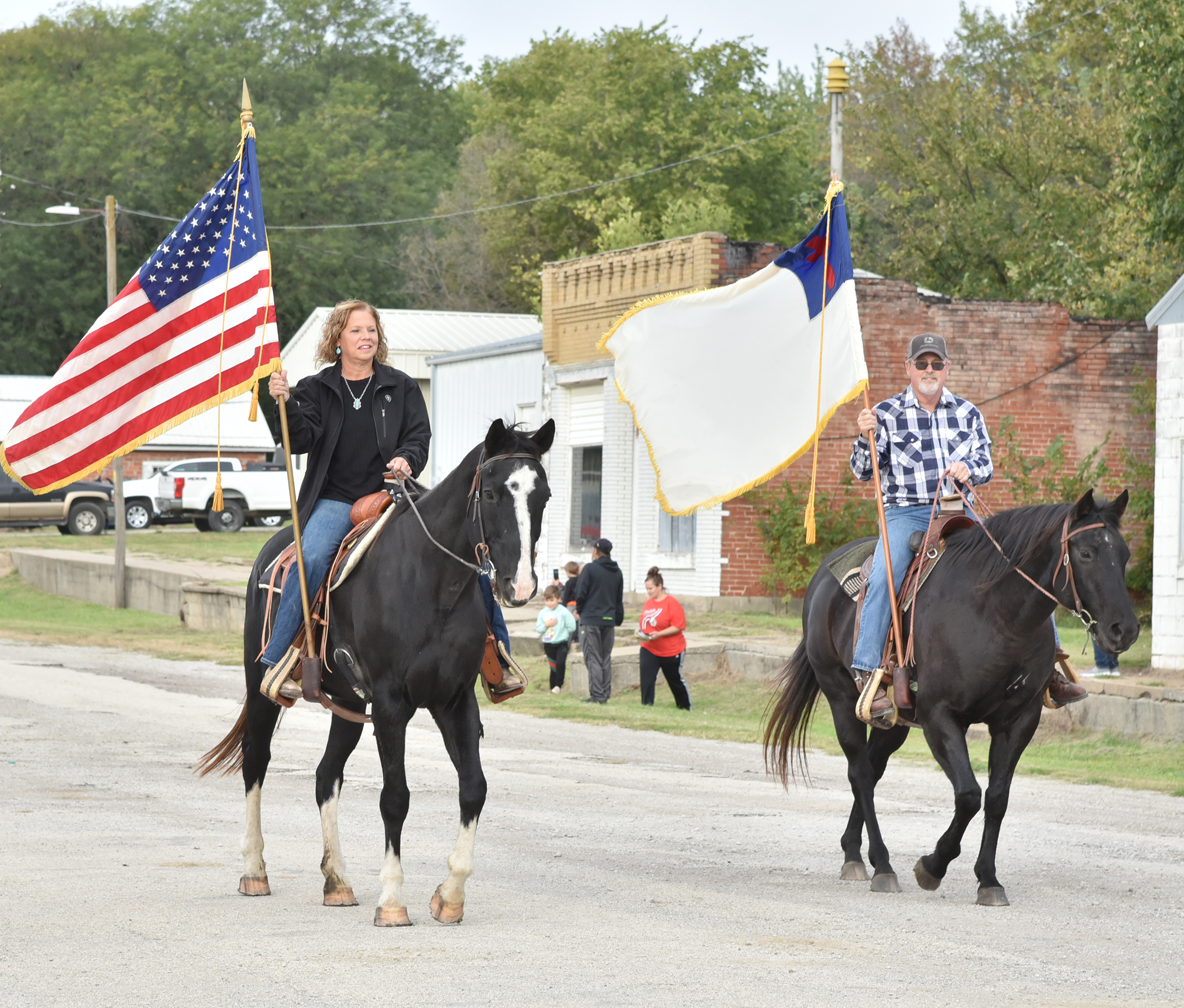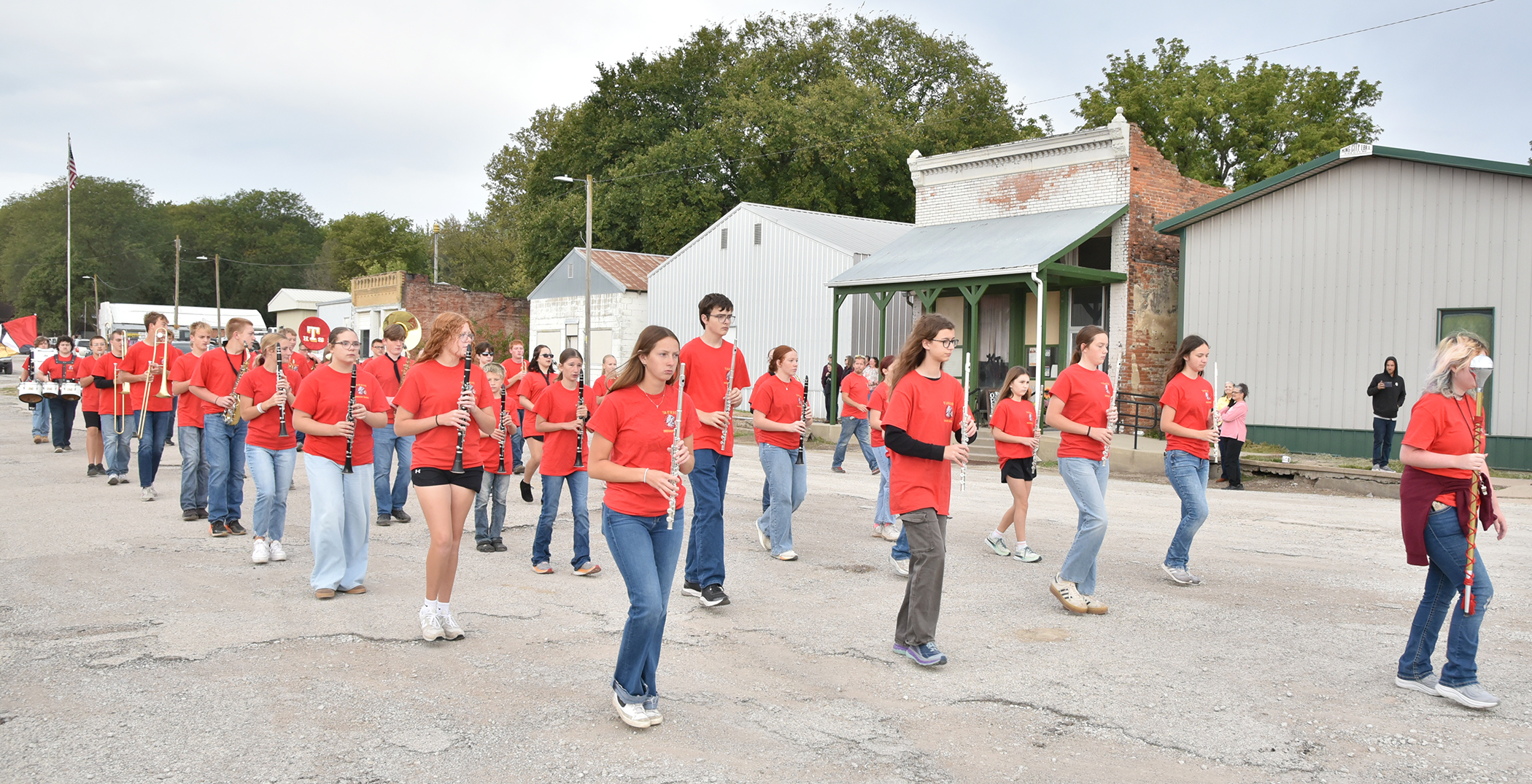 Participating in this year’s Lord’s Acre Day Parade were Tammy and Jeff Hall carrying the colors while riding their horses (above) and the Tarkio Marching Indians marching down Main (below).