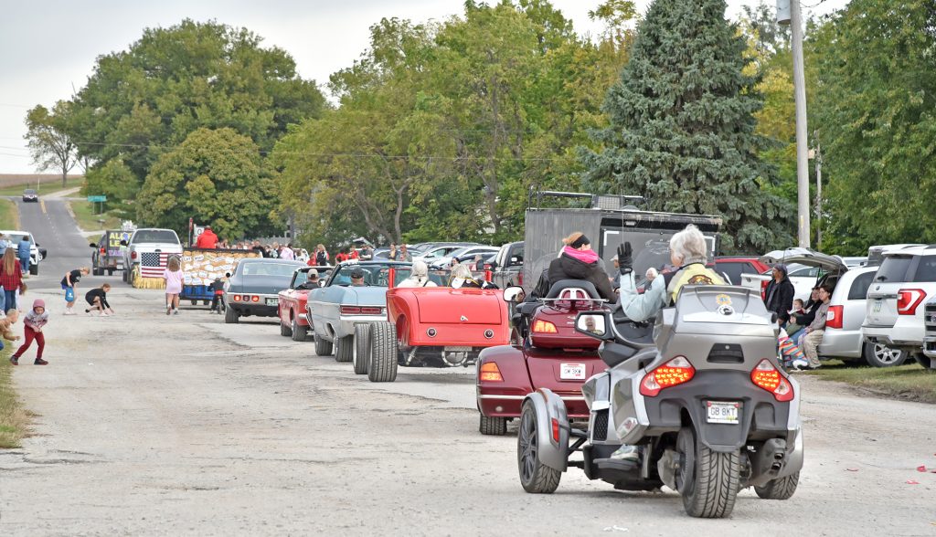 Several cars, motorcycles, farm machinery, and fire trucks drove in the parade.