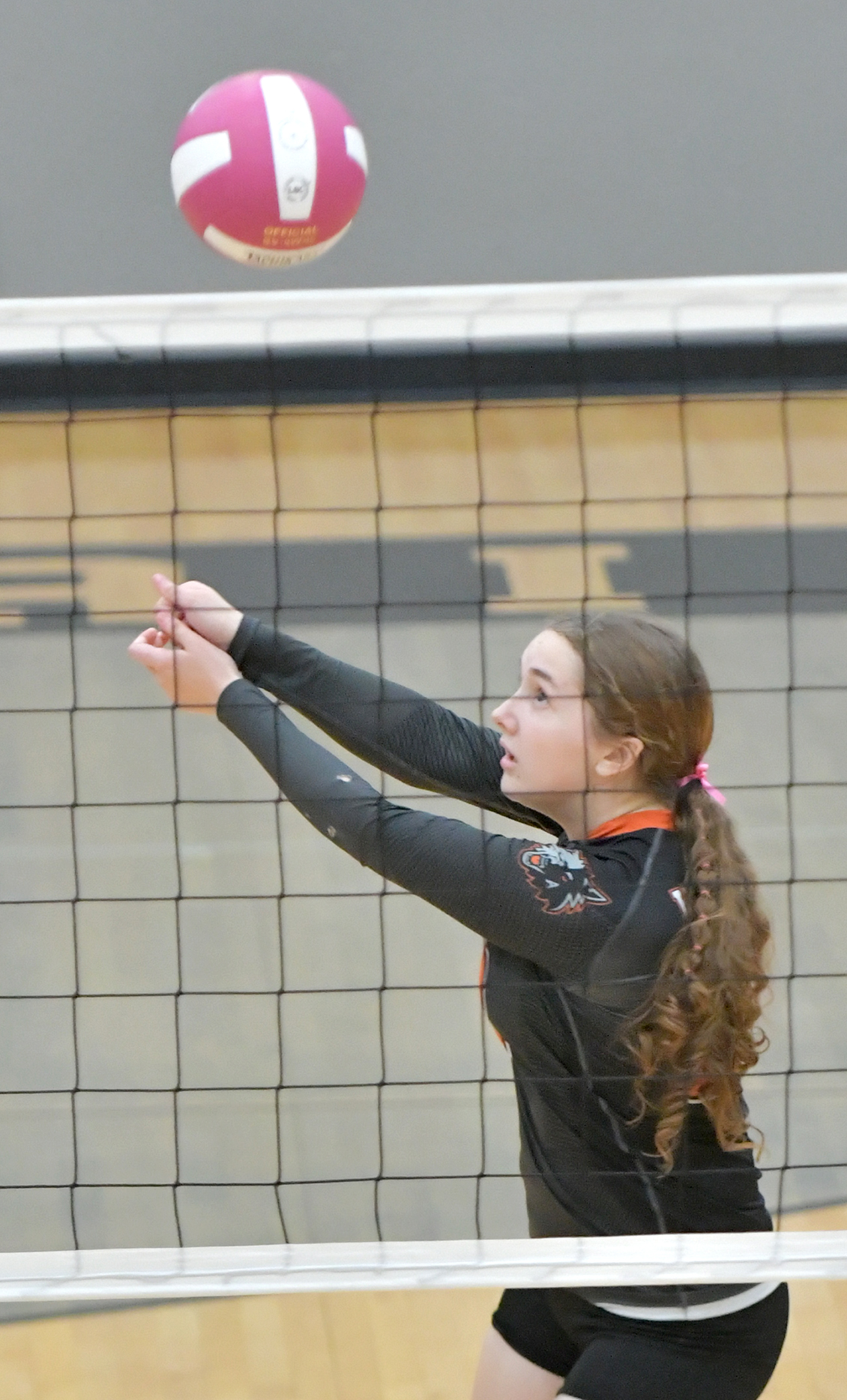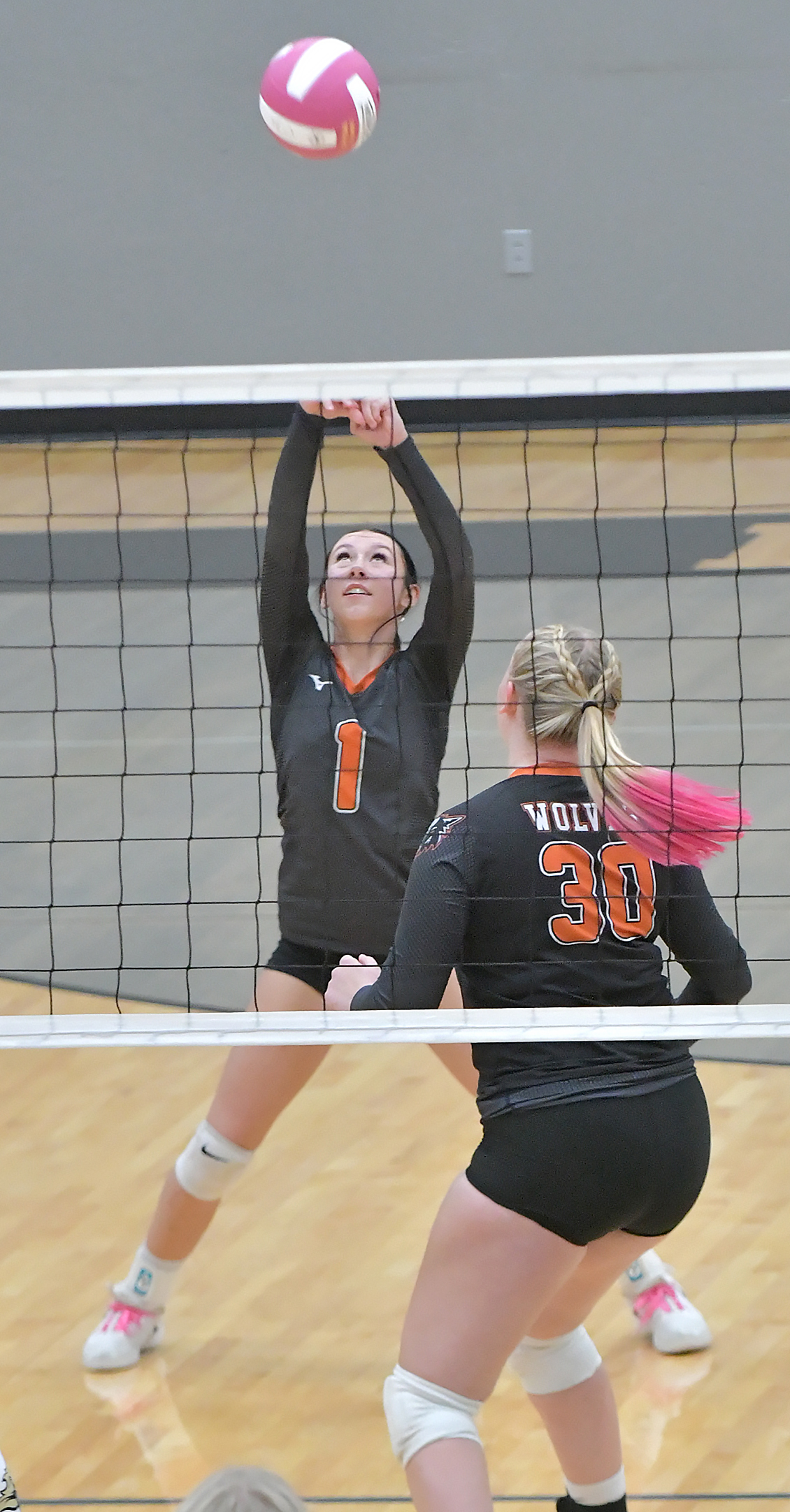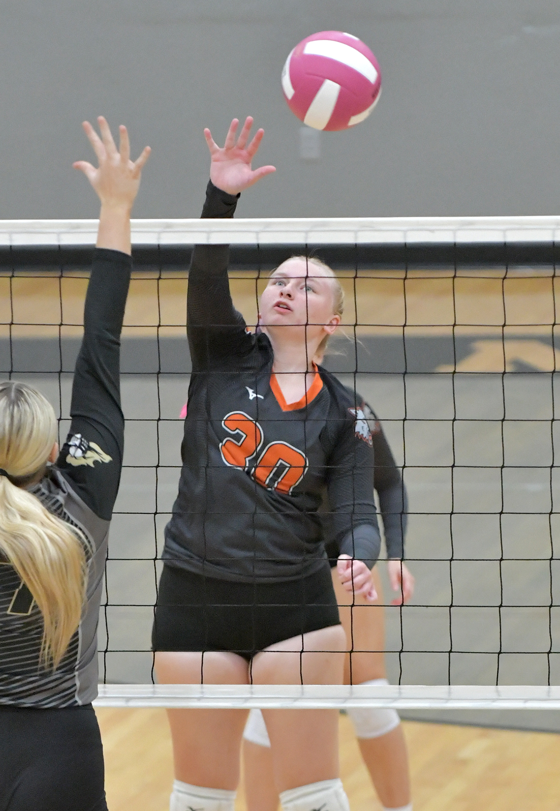 Rainy Nordausen keeps the action going as she take the ball over the net against South Holt.
