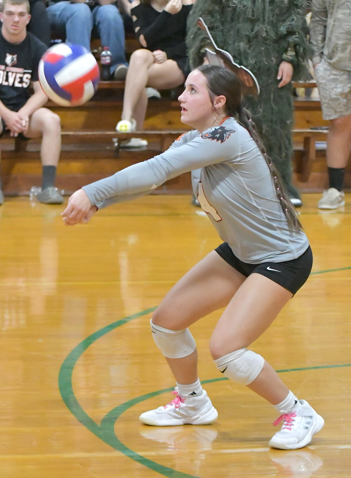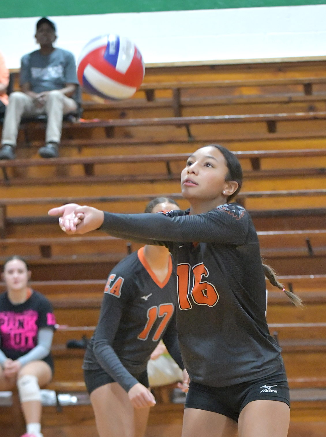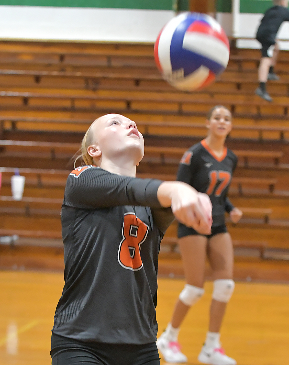 Rainy Nordausen keeps the action going as she take the ball over the net against South Holt.
