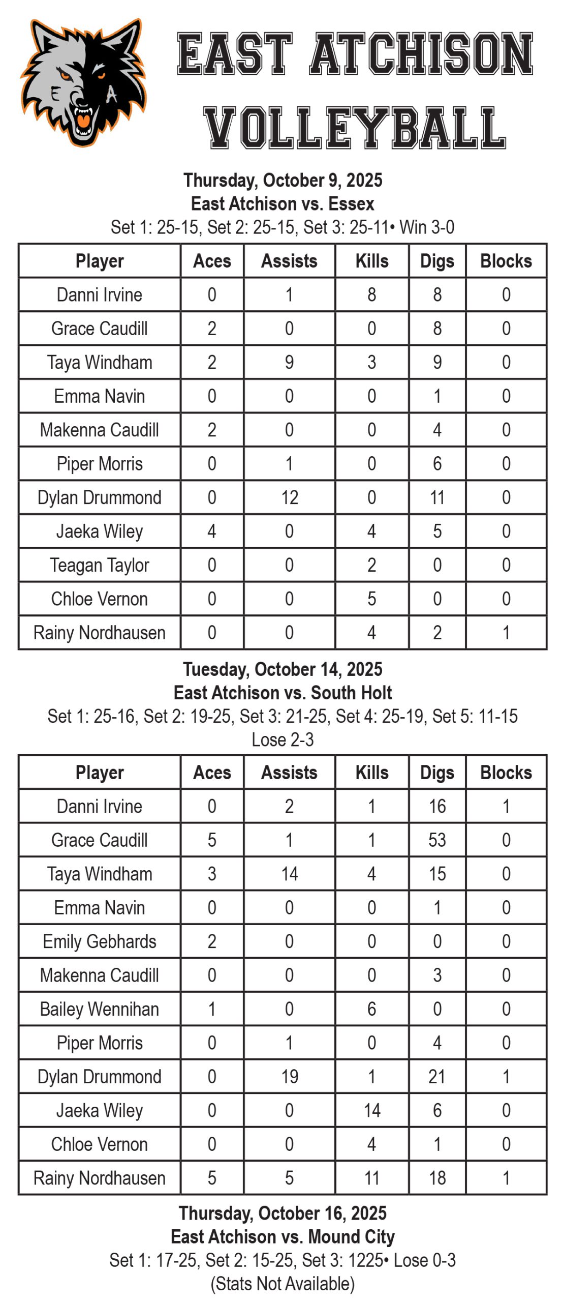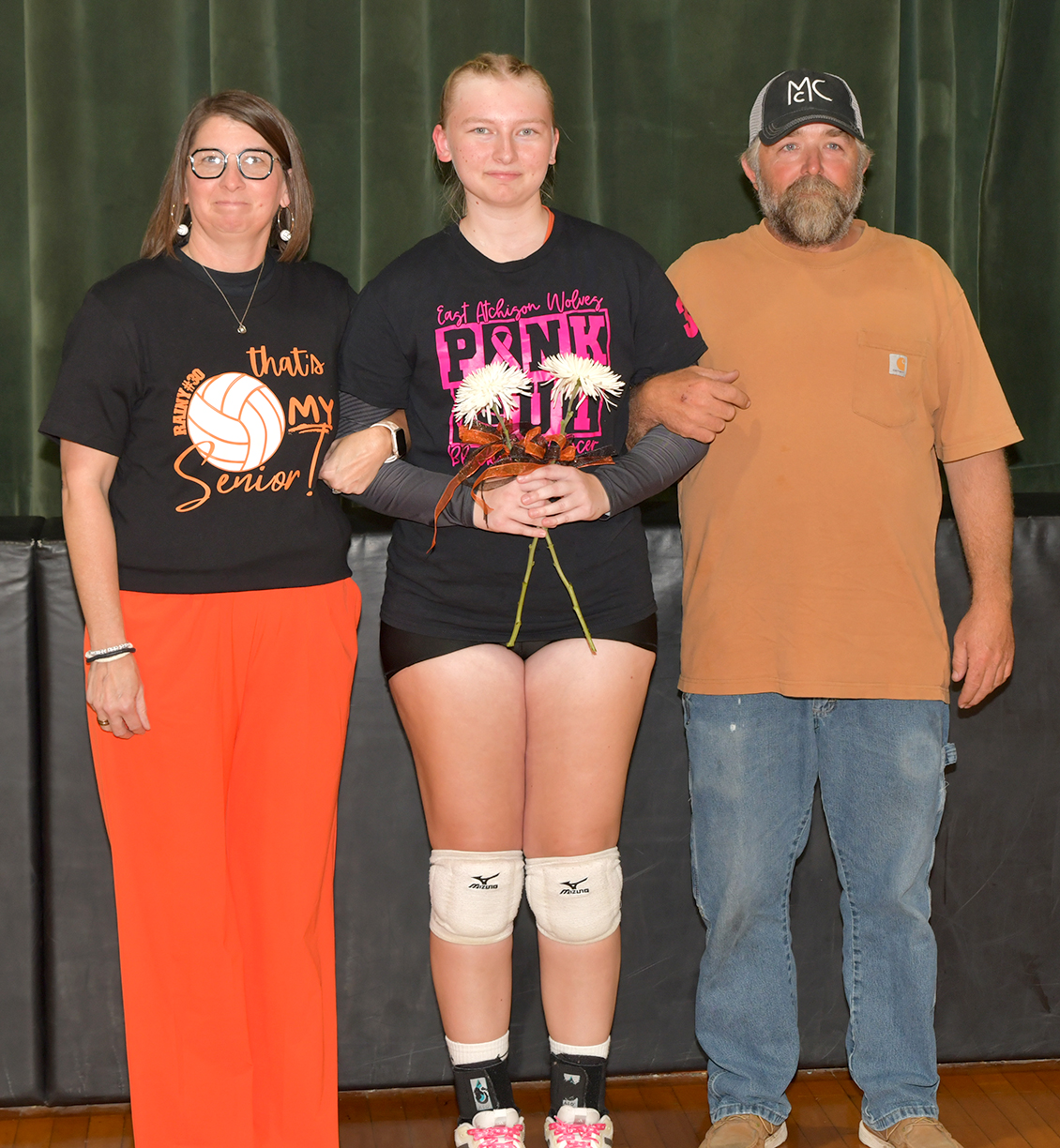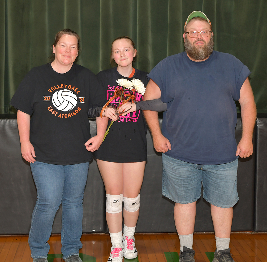 East Atchison senior volleyball players and their parents were recognized Thursday, October 16, 2025. Zoe Madron, daughter of Kate Curry and Aaron Madron, is not pictured.