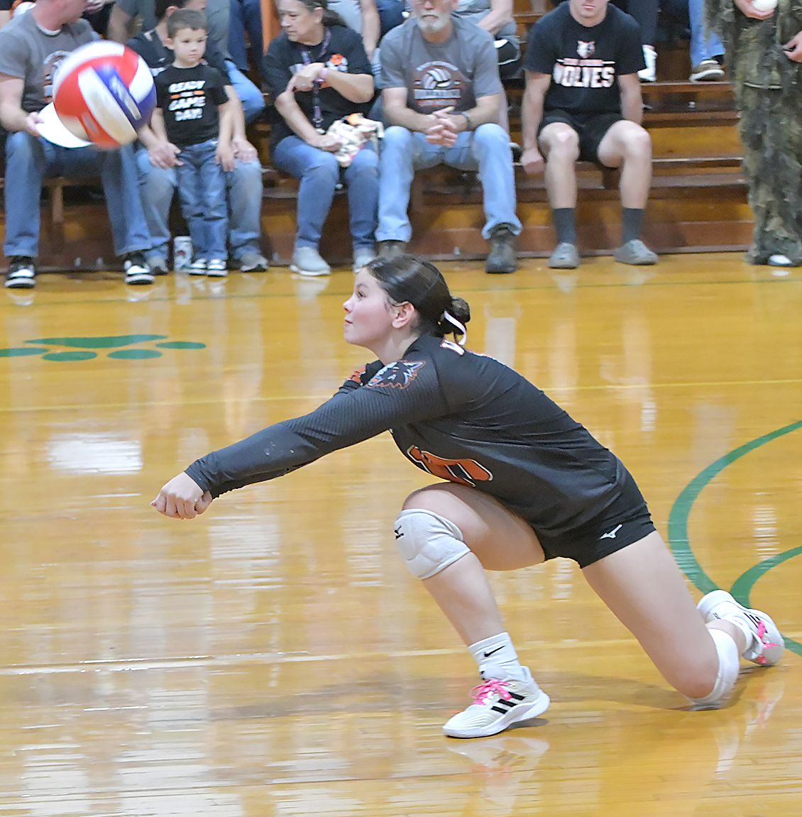 Makenna Caudill saves the volley as she takes it over the net against Mound City.