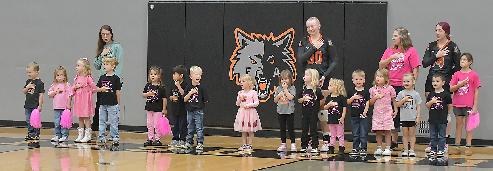 The Tarkio Kids’ Korner Preschool started the Pink Out volleyball game off Tuesday, October 14, with the Pledge of Allegiance.