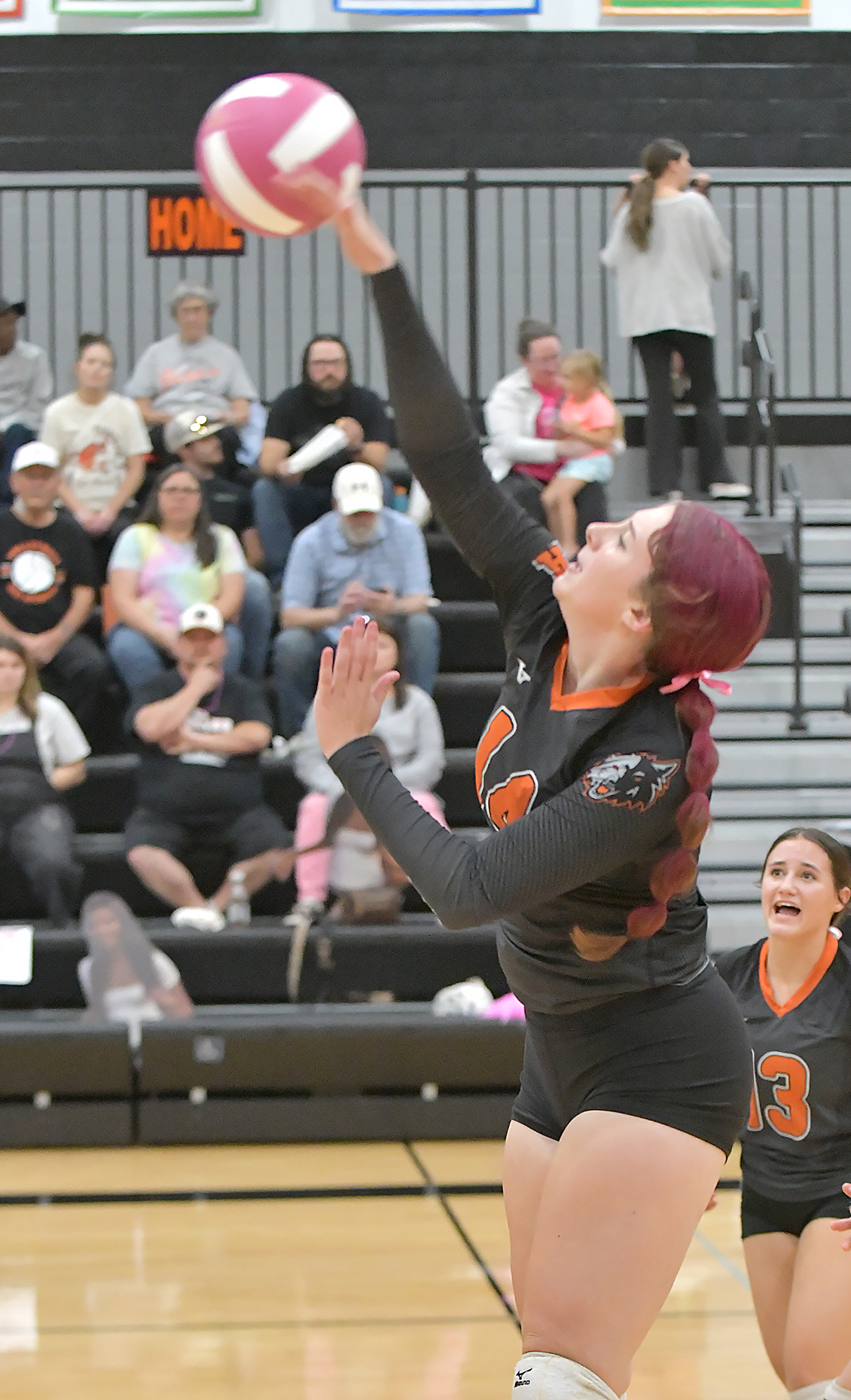 Emma Navin gets on top of the ball to spike it over against Mound City.