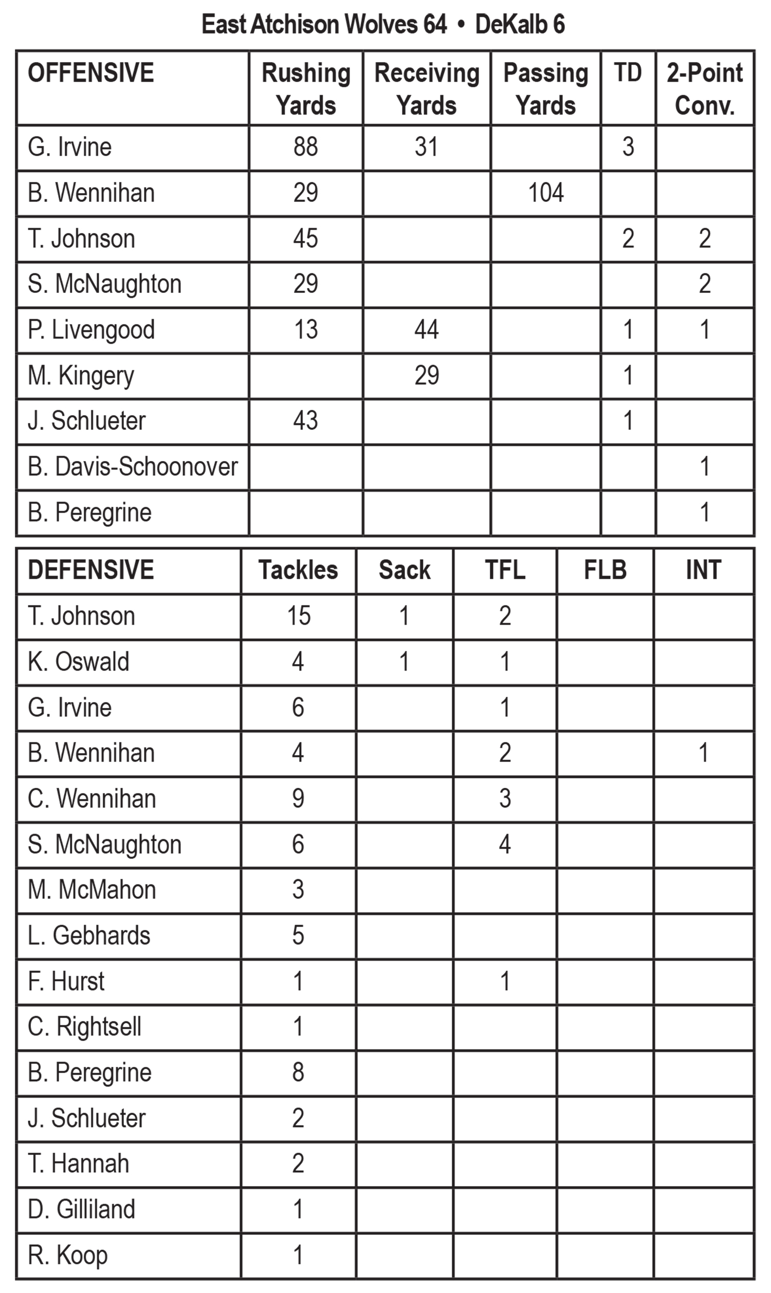 From the beginning, the Wolves dominated the game, scoring 22 points in the first quarter with senior Tate Johnson putting the first points on the board. Throughout the game eight different players either scored a touchdown or scored a two-point conversion, with touchdowns by Tate Johnson, Parker Livengood, Gavyn Irvine, Mason Kingery, and Josh Schlueter, and two-point conversions by Braxton Davis-Schoonover, Shaylon McNaughton and Bo Peregrine.