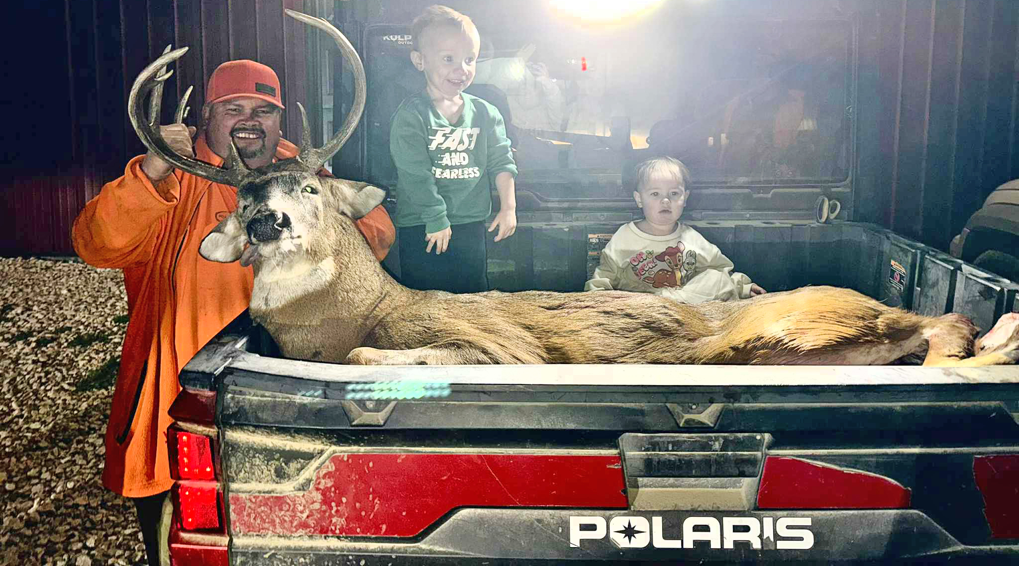 Billy Morris of Fairfax, Missouri, pictured with grandkids Bray Baughman and Millie Holecek, harvested an 11 point buck on November 16, 2025. (Brooklyn Baughman photo)