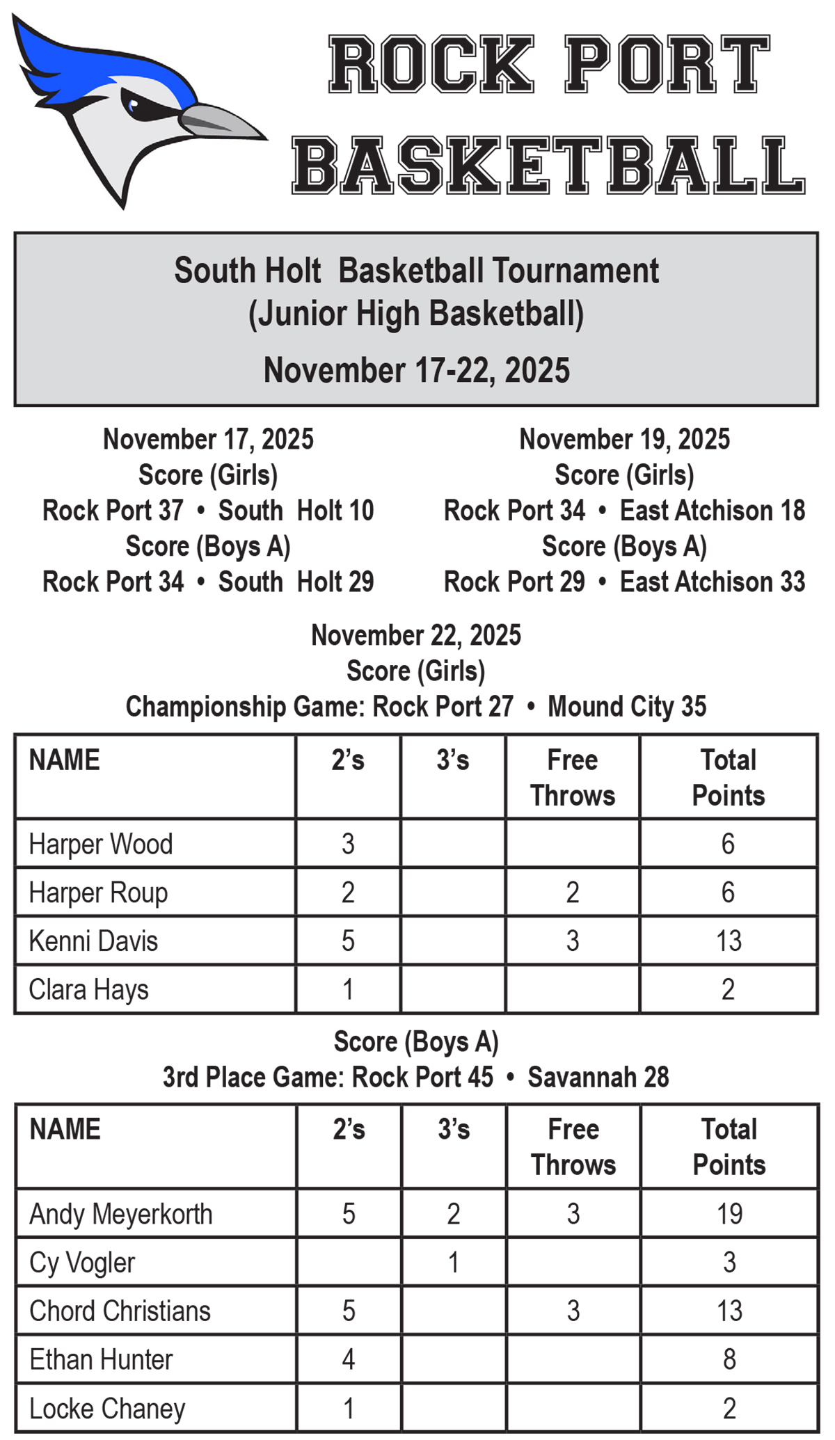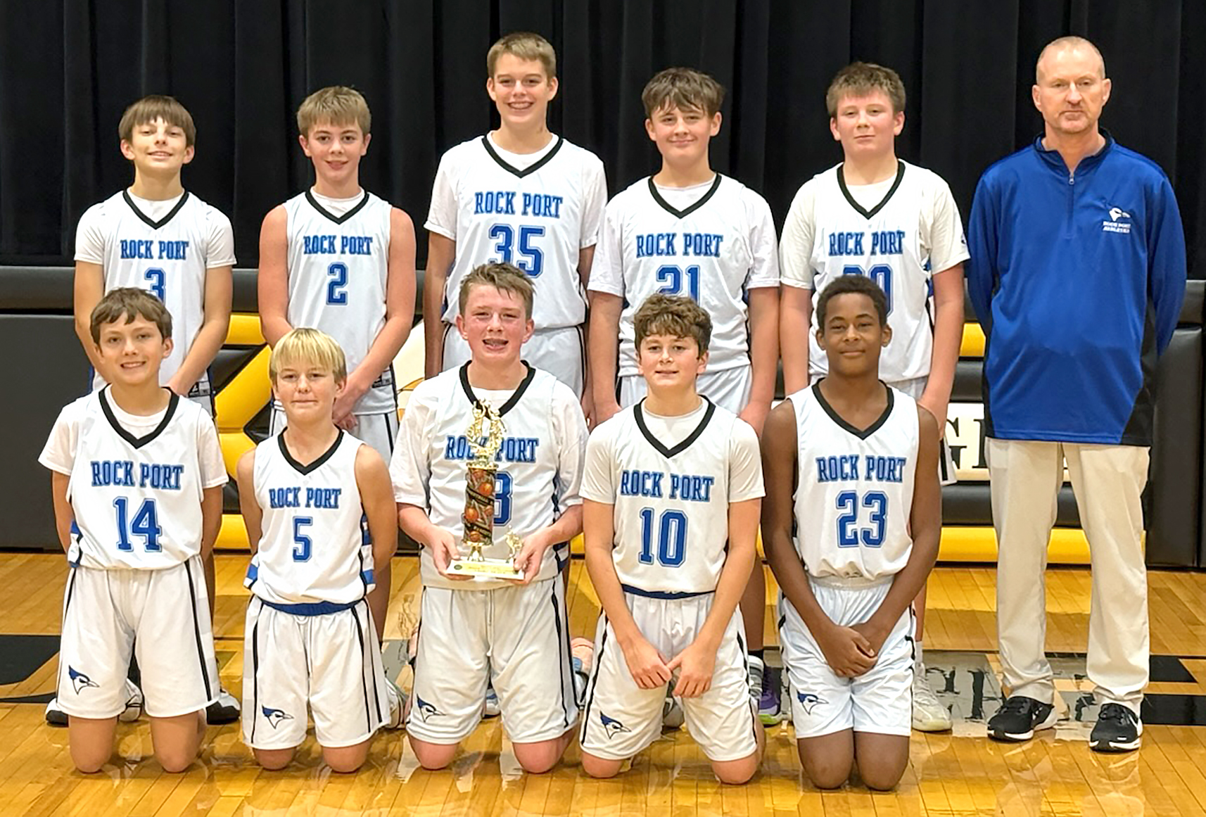 The Rock Port Junior High boys’ team placed third in the annual South Holt Junior High Basketball Tournament. Pictured, from left to right, are: front row – Kipton Waigand, Jadyn Jakub, Chord Christians, Zeke Gebhards, and Malachi Davis; and back row – Cy Vogler, Andy Meyerkorth, Isaac Dougherty, Locke Chaney, Ethan Hunter, and Coach Derek Petty. Coach Regan Griffin is not pictured. (Submitted photo)
