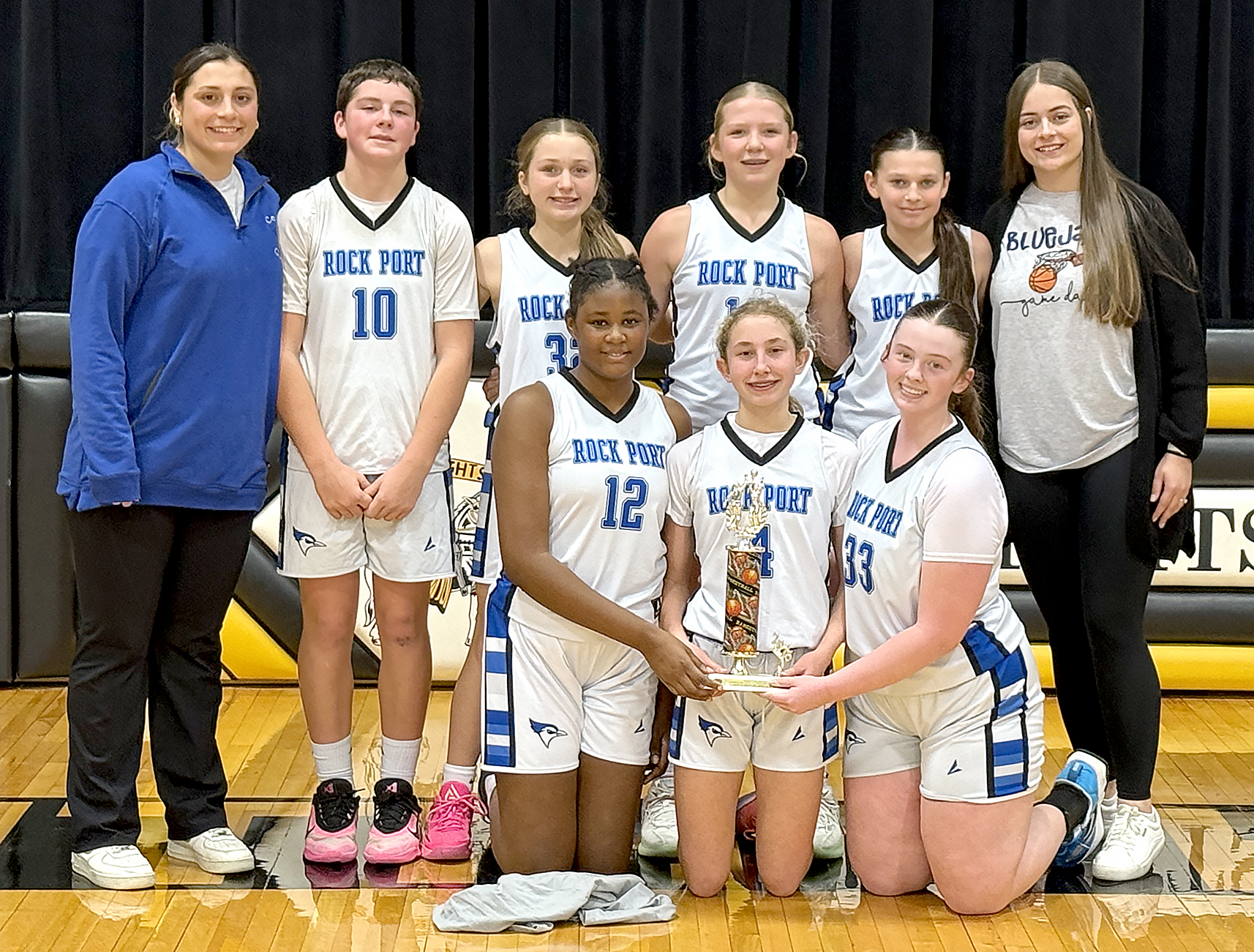 The Rock Port Junior High girls placed second in the annual South Holt Junior High Basketball Tournament. Pictured, from left to right, are: front row – Kenni Davis, Harper Wood, and Clara Hays; and back row – Coach Kelcie Gaines, Harper Roup, Kinsley Nuckolls, Ali Ellis, Kamryn Lair, and Coach Johnny Thomas. (Submitted photo)