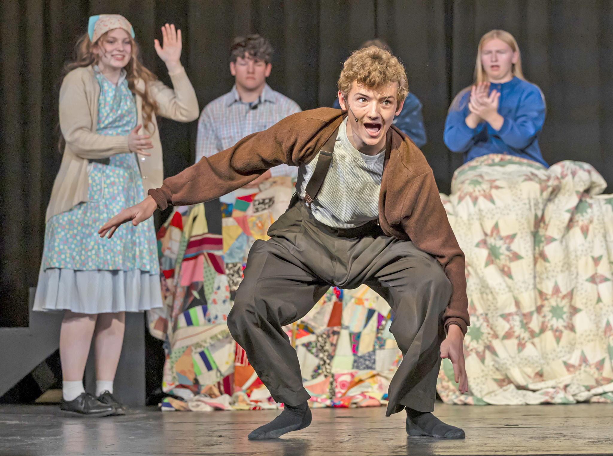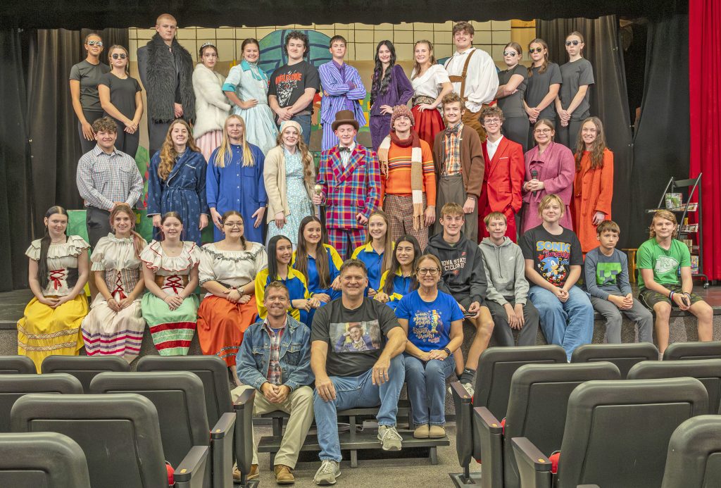 Based on the novel by Roald Dahl with songs from the motion picture by Leslie Bricusse and Anthony Newley, with music by Marc Shaiman and lyrics by Scott Wittman and Marc Shaiman, the production included the following cast of characters: Willy Wonka – Quin Staten; Charlie Bucket – Brody Wennihan; Mrs. Bucket – Zoe Madron; Grandpa Joe – Isaac Vette; Josephine – Rainy Nordhausen; Georgina – Jaeka Wiley; George – Jax Peregrine; Augustus Gloop – Bo Peregrine; Mrs. Gloop – Rhoni Caudill; Veruca Salt – Taya Windham; Mr. Salt – Finn Hurst; Violet Beauregarde – Bailey Wennihan; Mr. Beauregarde – Jeremy Bomar; Mike Teavee – Treyton Brown; Mrs. Teavee – Macy Stepp; Jerry Jubilee – Robbie Armstrong; Cherry Sundae – Olivia Schaefer; Mrs. Green – Delainee White; Gloop Troop – Gabriella Hogue, AJ Melton, Raelee Russell, and Braelynn Weber; Salt Bodyguards – Keely Bredensteiner, Xabrina Klinger, Teagan Taylor, Gracie Walker, and Azlynn Wiley; Gum Chompin’ Divas – Danika Agnew, Bella Bywater, Dylan Drummond, Danni Irvine, and Bresayda Jimenez; Teavee Gamers – Xachary Klinger, Annalise Martin, Ben Rolf, Josh Schlueter, and Owen Vette; Oompa Loompas – Danika Agnew, Keely Bredensteiner, Bella Bywater, Dylan Drummond, Gabriella Hogue, Danni Irvine, Bresayda Jimenez, Xabrina and Xachary Klinger, Zoe Madron, Annalise Martin, AJ Melton, Rainy Nordhausen, Ben Rolf, Raelee Russell, Josh Schlueter, Teagan Taylor, Owen Vette, Gracie Walker, Braelynn Weber, Delainee White, Azlynn Wiley, and Jaeka Wiley; and Squirrels – Robbie Armstrong, Jax Peregrine, and Olivia Schaefer. The play was directed by Casey Martin, with Melody Barnett providing the musical direction and Nathaniel Wehmeyer the sound direction. Mark Staten was the light director, with Tucker Hurst and Bryar Wennihan providing spot tech. Lori Staten was the food director. The art students, Zoe Madron, Raelee Russell, and Kennedy White, with assistance from teacher Courtney Meyerkorth, painted the set. The Oompa Wranglers were Shannon Bruns and Jackie Martin.