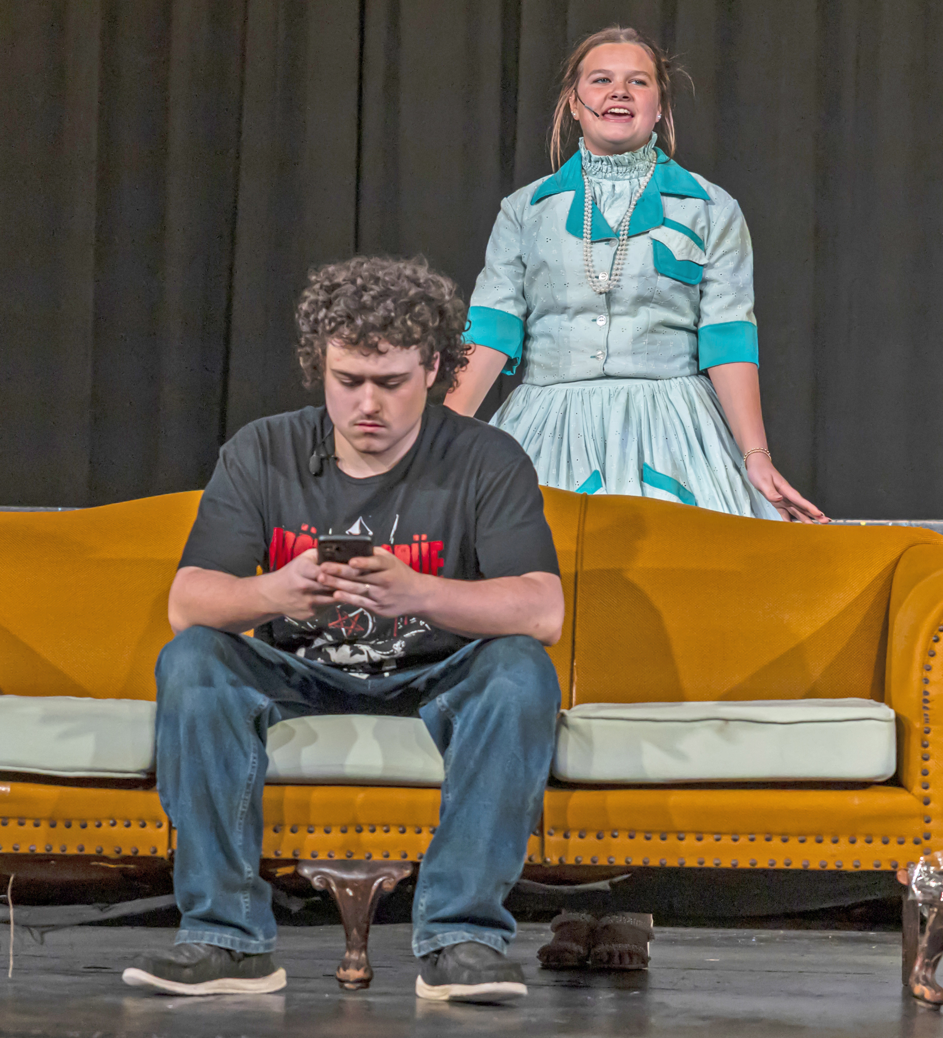 Mike Teavee was portrayed by Treyton Brown, front, and Mrs. Teavee was portrayed by Macy Stepp, back.