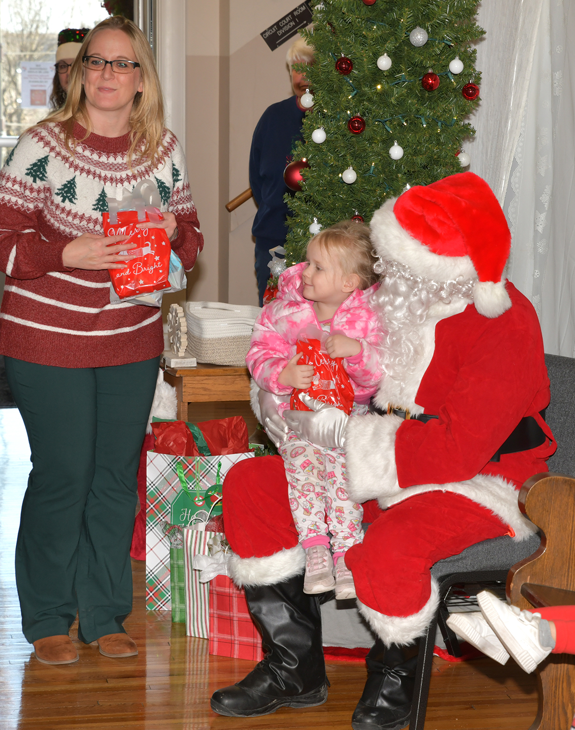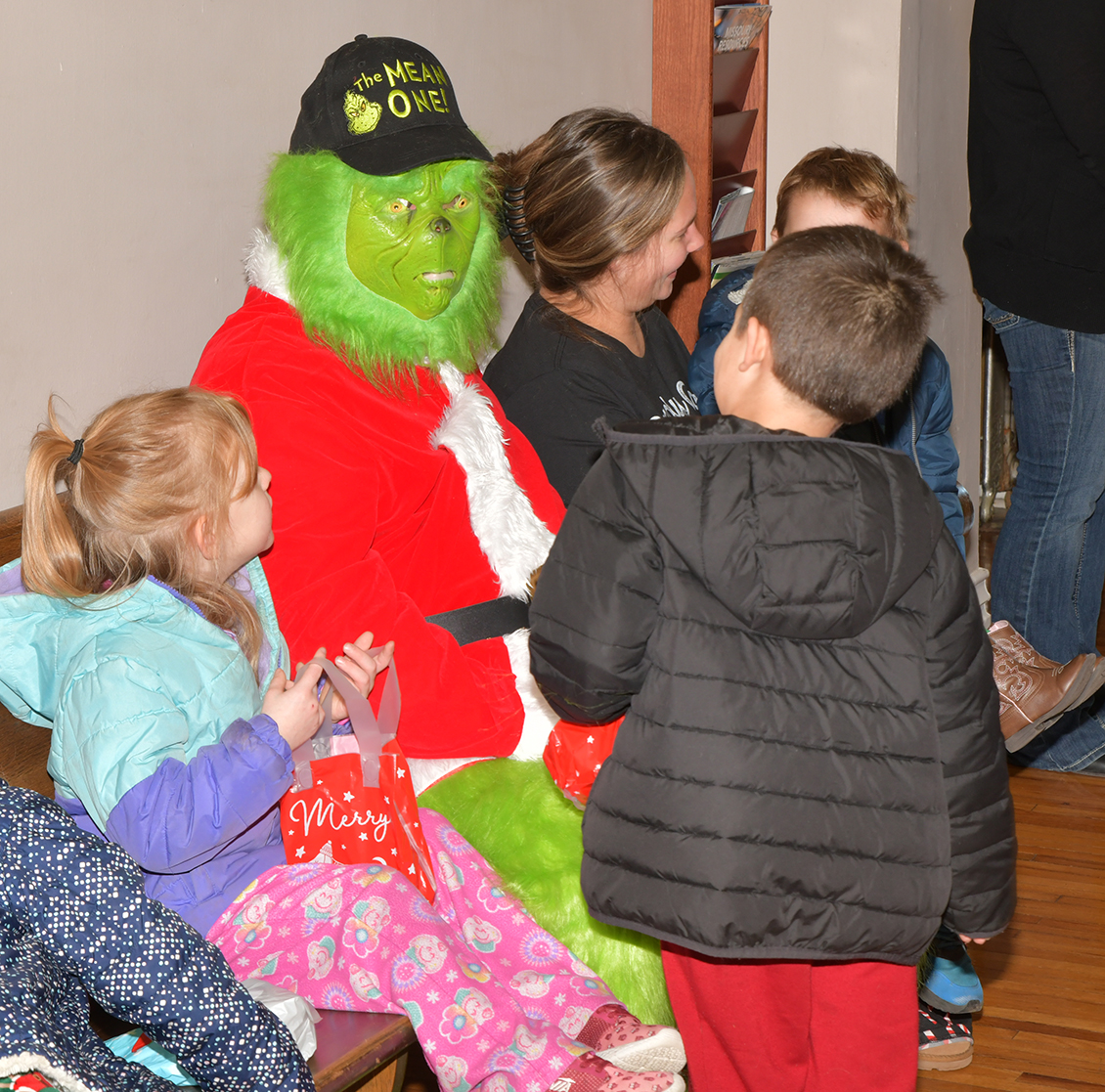 Santa Claus and the Grinch stopped by the Atchison County Courthouse Friday, December 19, to visit the students from Atchison County Head Start, who came by to sing Christmas carols. At top, the Grinch entertains Amelia Pinzino, Raylen Turner, and Dominic Vandevere while they wait their turn to see Santa.
