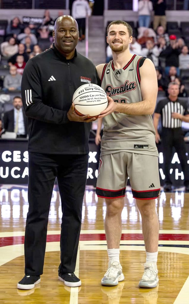 Tony Osburn, a senior guard for the Omaha Mavericks, scored his 1,000th career point Thursday, January 8, 2026. He hit a three-pointer in the opening minutes of the team’s game against North Dakota, becoming the 45th player in program history to reach that milestone. Tony, the son of Ryan and Sarah Osburn, Fairfax, Missouri, is pictured with Head Coach Chris Crutchfield. (Omaha Men’s Basketball Facebook photo)