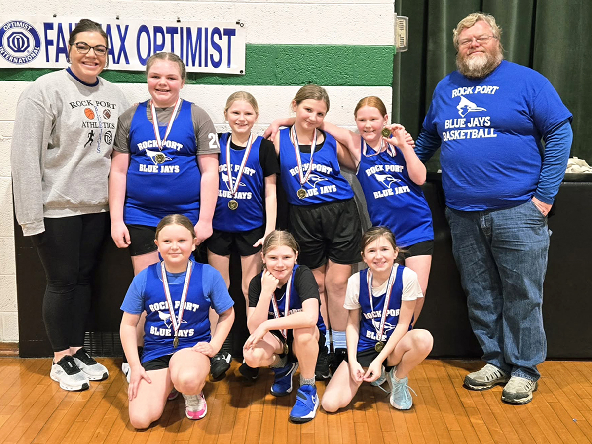 The Fairfax Optimist Club held a youth basketball tournament Saturday, January 31, 2026, in Fairfax, Missouri, for area third and fourth graders. The fourth grade Rock Port Lady Blue Jays won the girls’ bracket, defeating Mound City, East Atchison, and the Rock Port third grade team. Team members include, from left to right: front row – Remi Stoner, Gentry Moore, and Elsie Gubser; and back row – Coach Breanna VanSickle, Piper VanSickle, Greenly Moore, Kylee Perry, Ella Sperber, and Coach Jody VanSickle. (Submitted photo)