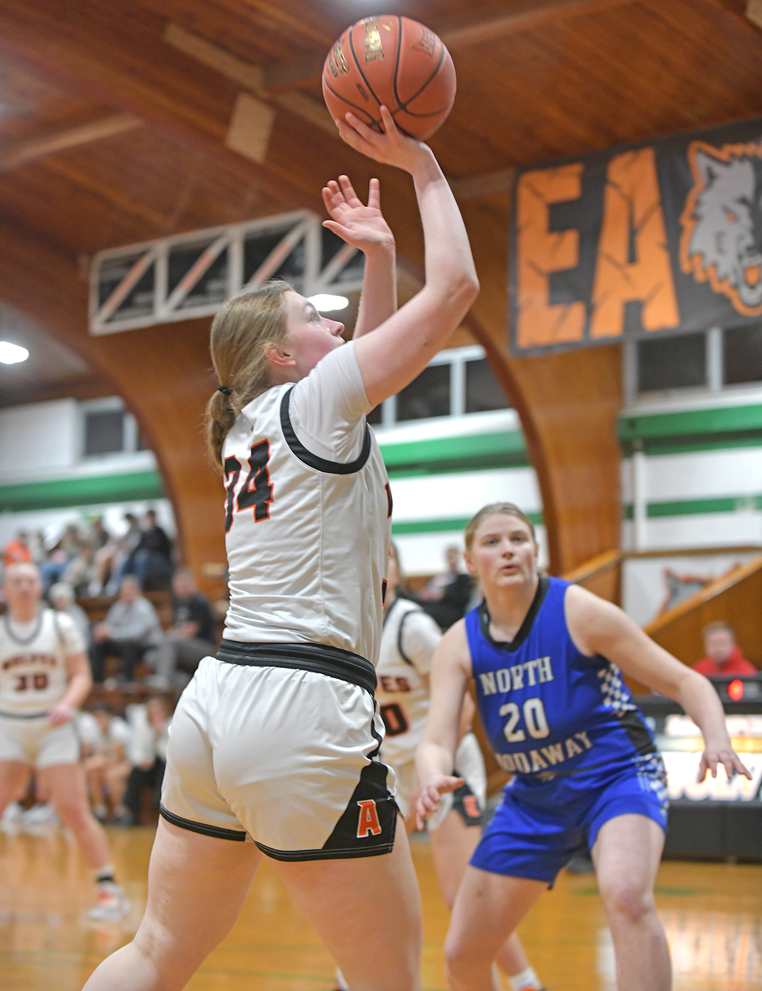 Senior Zoe Madron puts up a shot for two in the Lady Wolves’ win over North Nodaway.