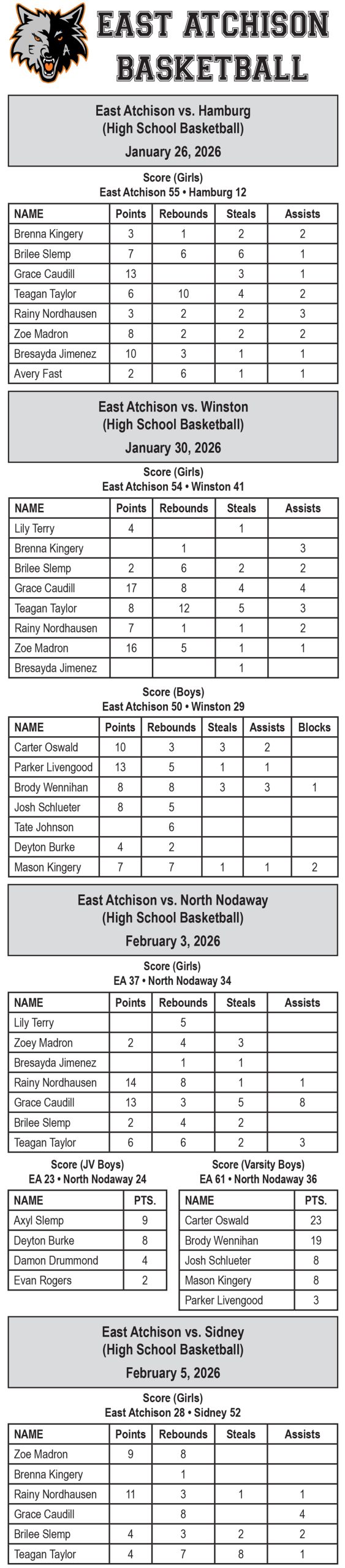 Axyl Slemp scored nine points in the JV Wolves’ game against North Nodaway.