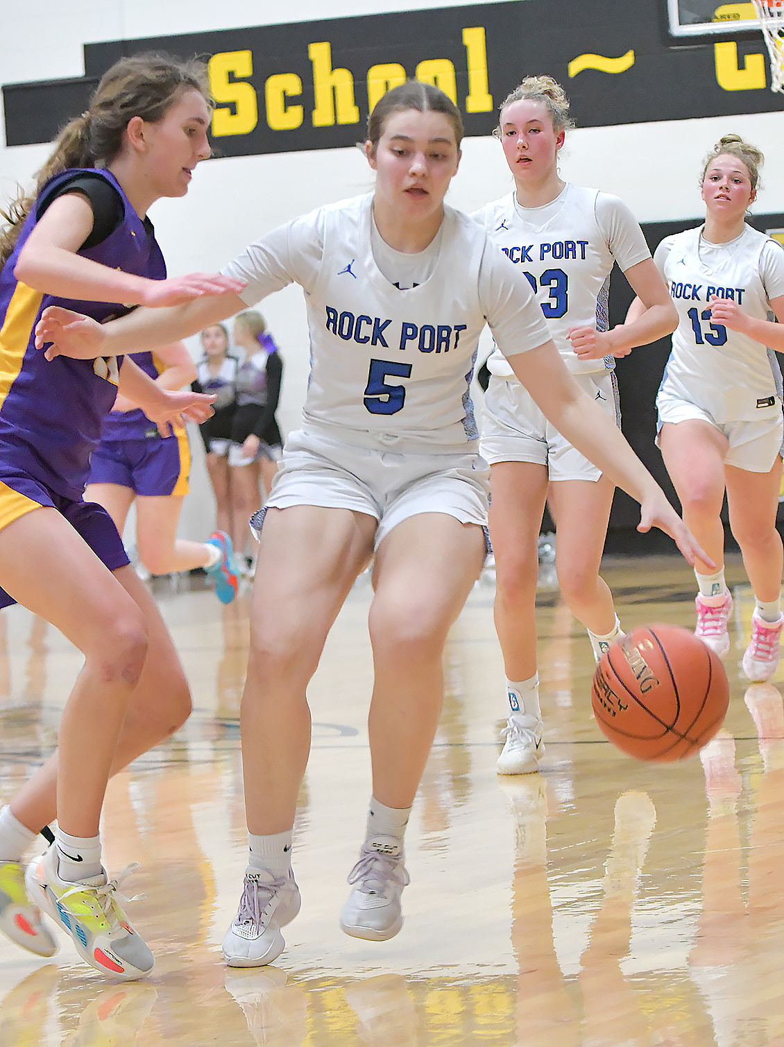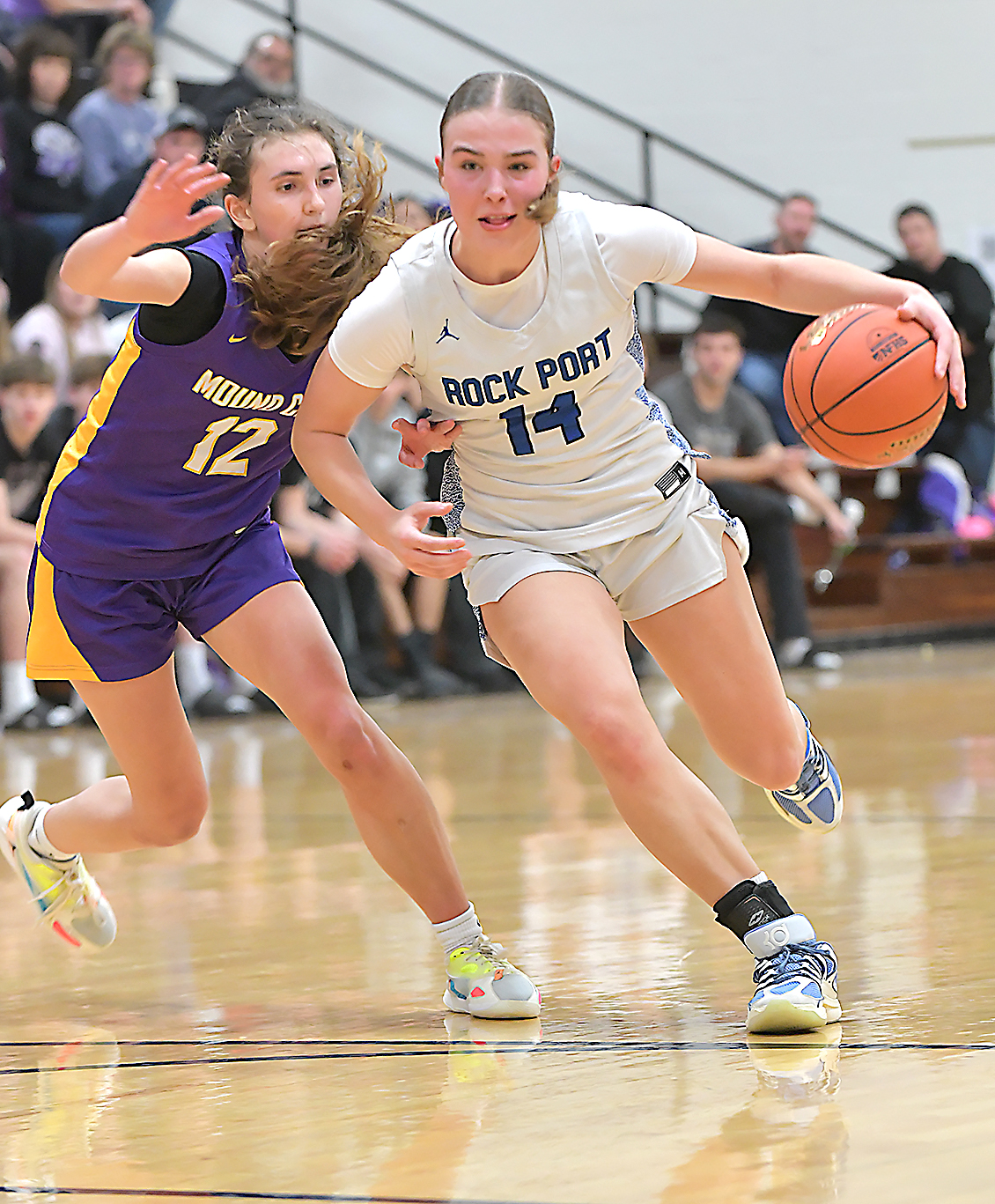 Audrie Meyerkorth sees an opening down the lane as she drives past Mound City’s defender, Selah Meadows. Audrie had 11 points in the win over Mound City.