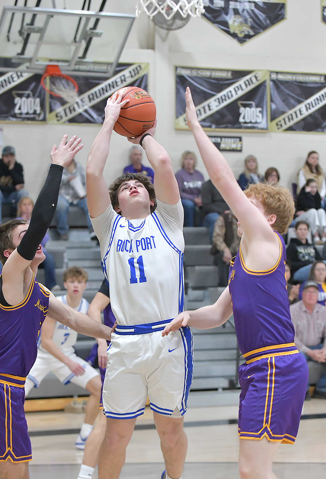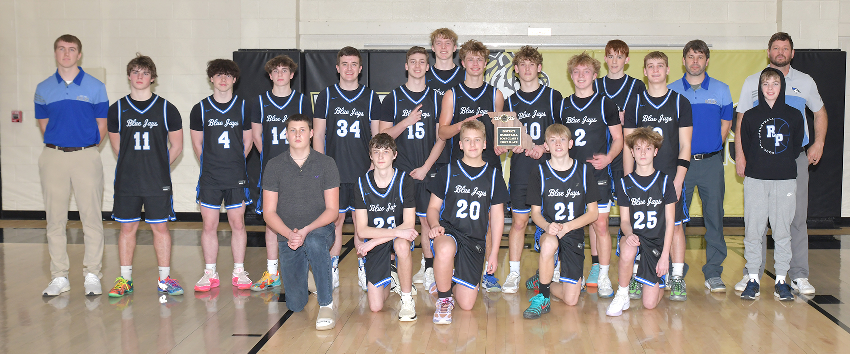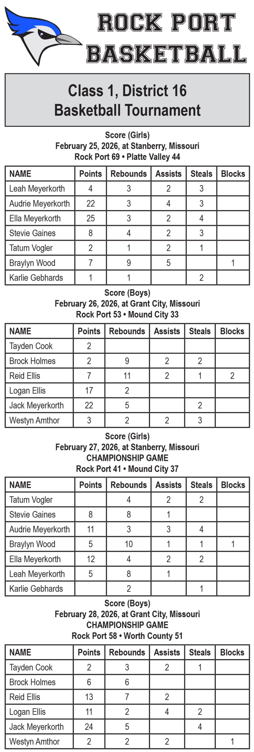 The Rock Port boys won their second consecutive District 16 title Saturday, February 28, 2026, against Worth County. Pictured above, from left to right, are: front row – Jacob McMahon, Landon Melton-Burrell, Grant Spiegel, Grady Cook, and Rush Lewis; and back row – Assistant Coach Aidan Burke, Brock Holmes, Tennyson Lansdown, Ryzer Hale, Jaxson Smith, Case Millsap, Reid Ellis, Jack Meyerkorth, Tayden Cook, Logan Ellis, Wyatt Huntley, Westyn Amthor, Assistant Coach Jared Meyerkorth, Andy Meyerkorth, and Head Coach Aaron Carpenter.