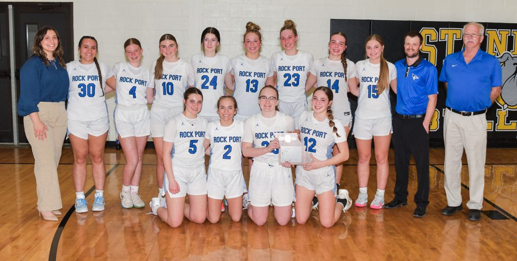 The Rock Port girls defended their District 16 title, winning back to back championships. Pictured above, from left to right, are: front row – Tatum Vogler, Landrey Kelly, Alexis Stanton, and Ella Meyerkorth; and back row – Assistant Coach Kelcie Gaines, Jaylynn Jones, Raylynn Jenkins, Karlie Gebhards, Claire Miller, Stevie Gaines, Braylyn Wood, Audrie Meyerkorth, Leah Meyerkorth, Head Coach Austin Alitz, and Assistant Coach Gary Davis.