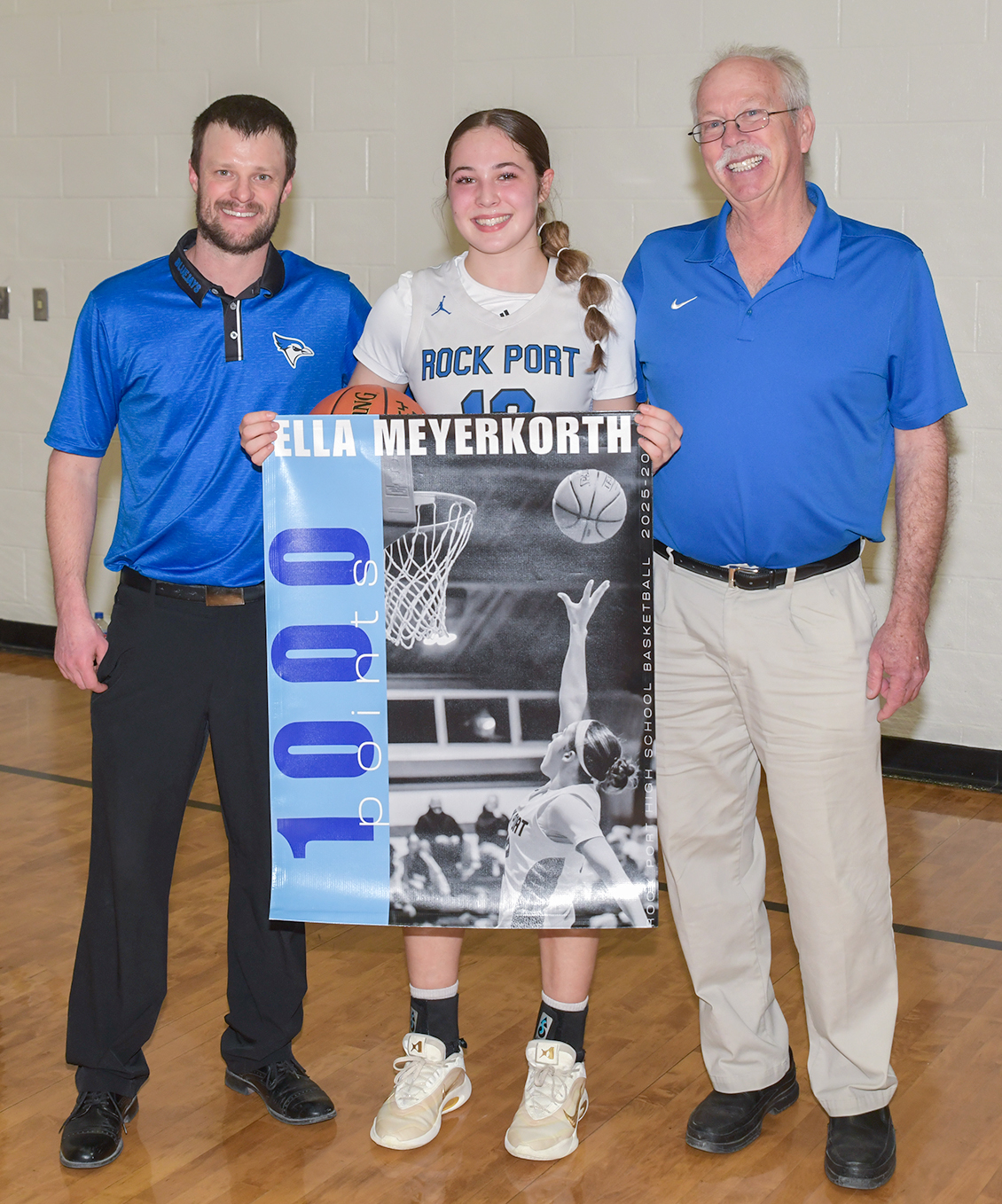 Ella Meyerkorth surpassed 1,000 points against Mound City in the District 16 championship. Ella is pictured with her coaches Austin Alitz, left, and Gary Davis, right.