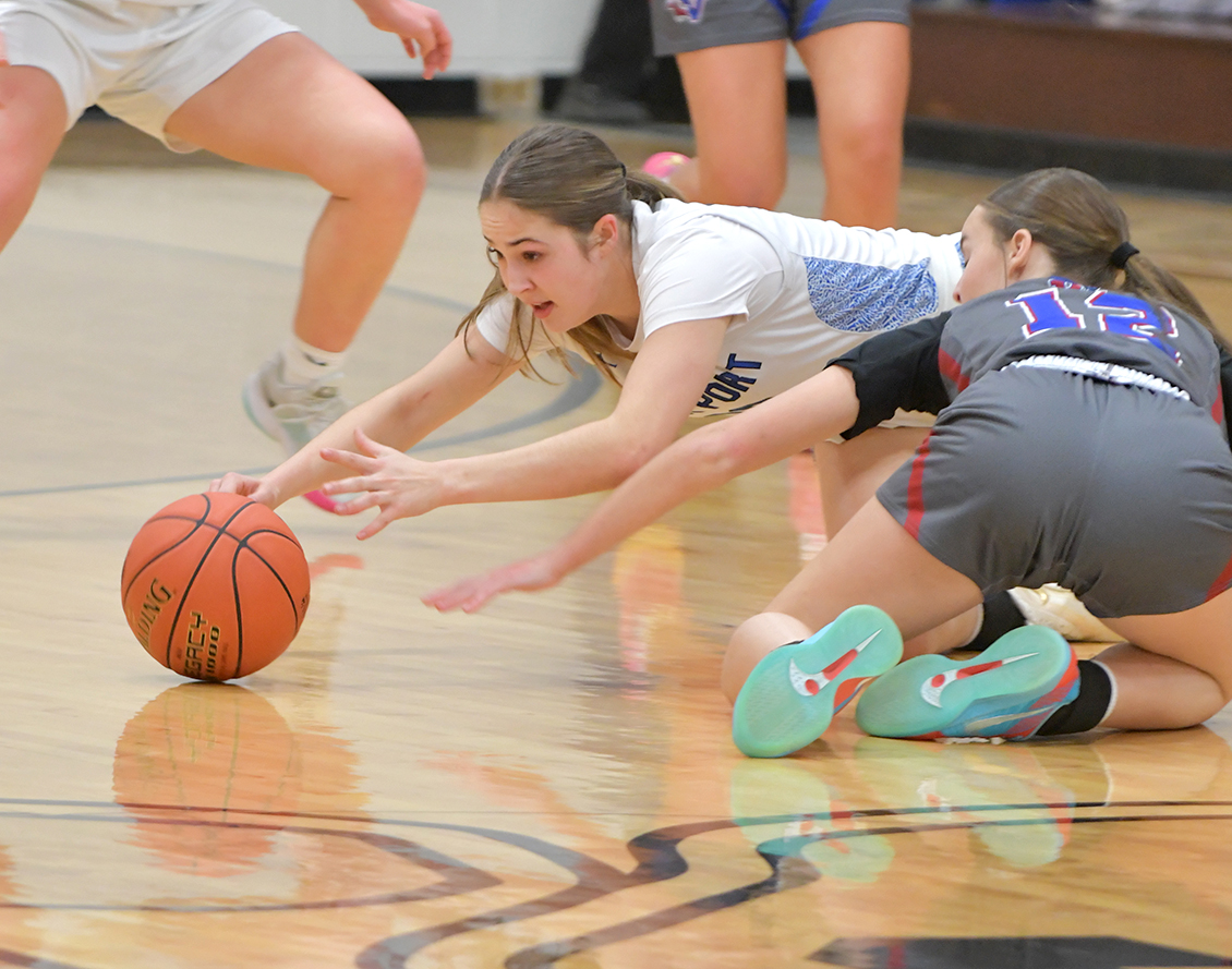 In the Platte Valley game, Ella Meyerkorth knocks a ball loose from Makenna Wolf and dives after it to gain possession.