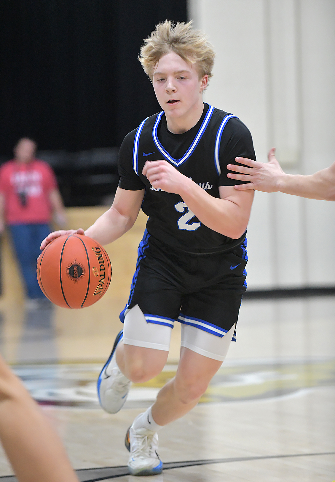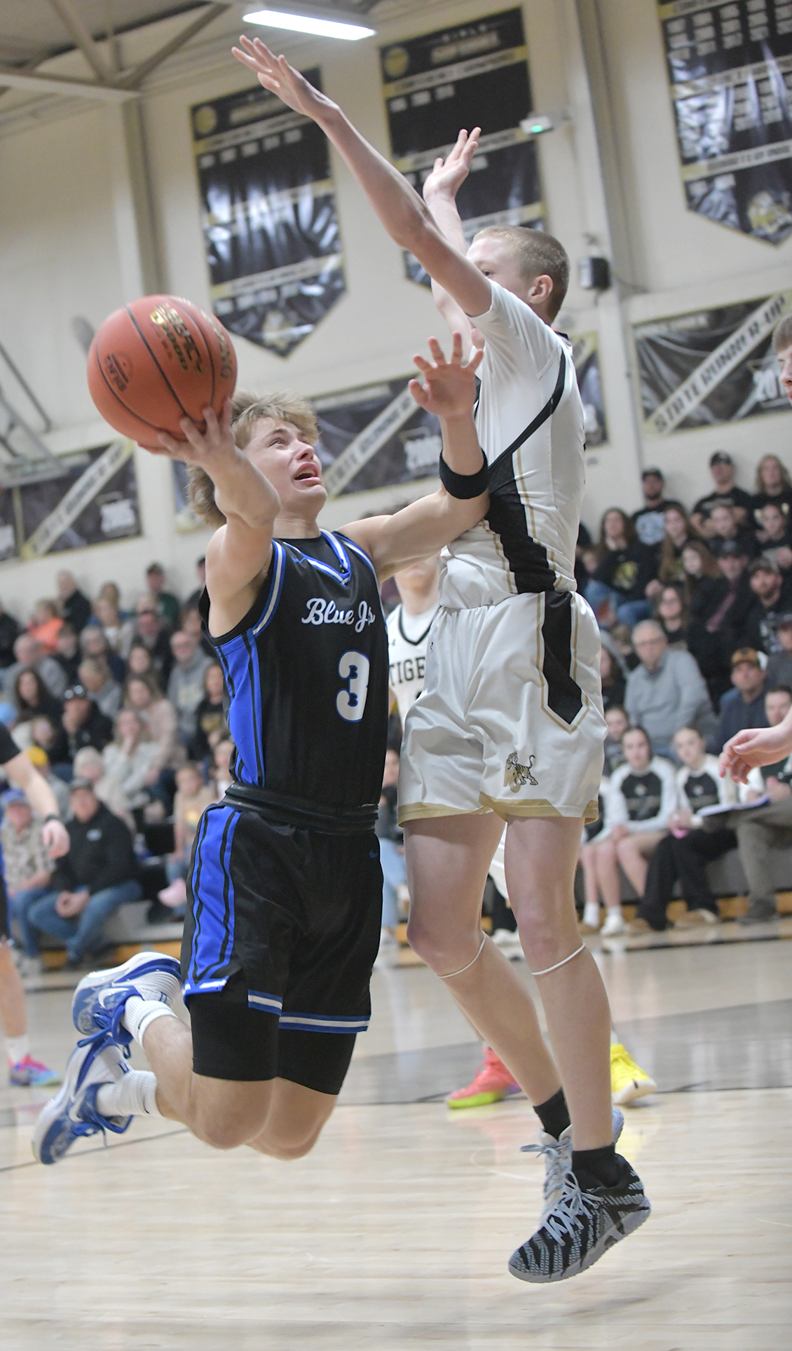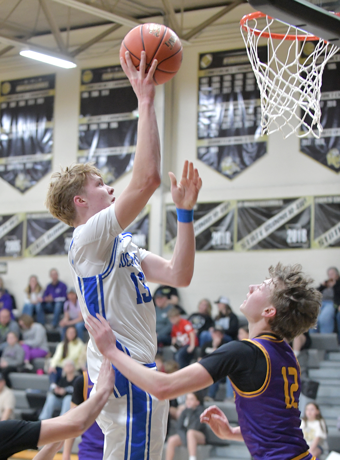 Reid Ellis goes up over Mound City’s Liam Derr as he gets two of his seven points on the night.
