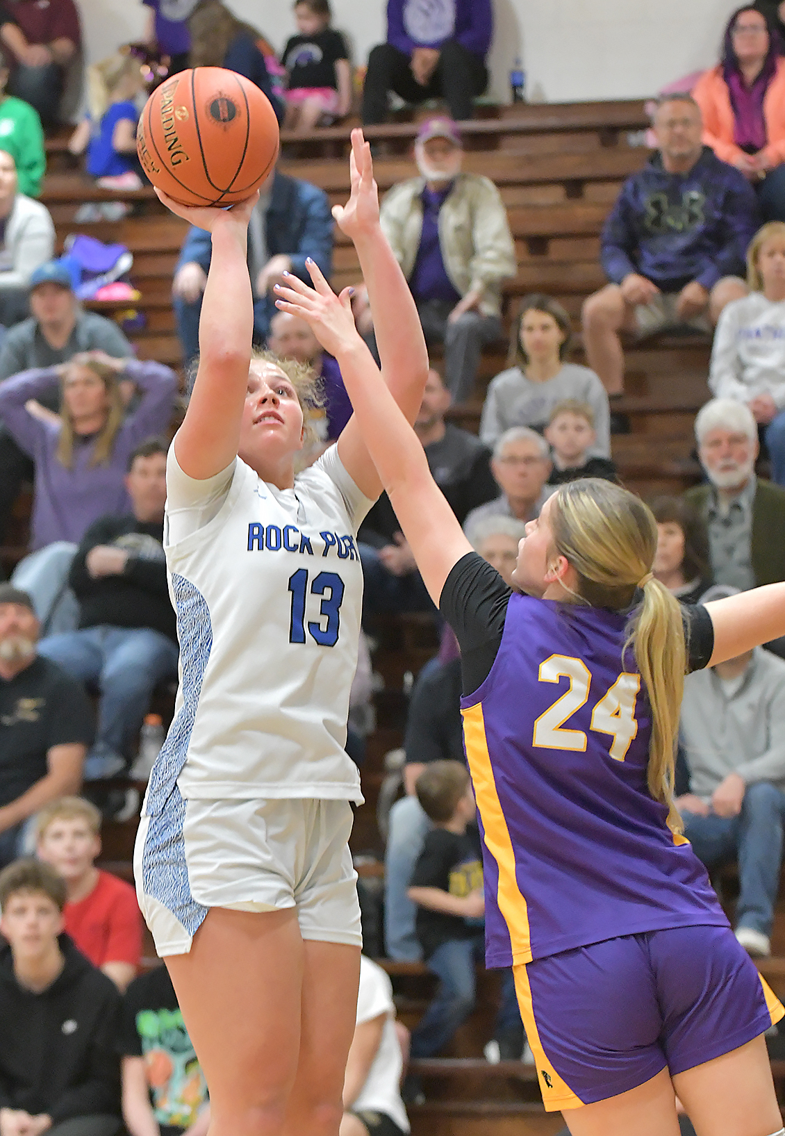 Braylyn Wood fights for the rebound with Sophie Biermann, Mound City. Braylyn had 10 rebounds for the night.