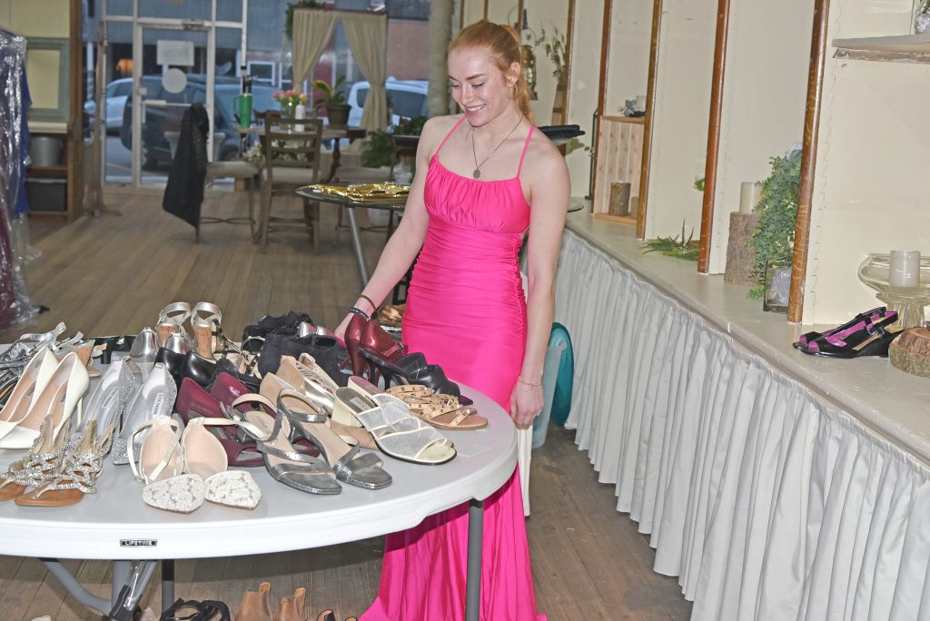 Boundless Grace in Tarkio held its second annual Prom Project Wednesday through Friday of last week. Prom dresses, men’s suits, dress pants, dress shirts, dress shoes, and accessories were available at no charge on a first come, first served basis. This is a great project that allows local teens to find beautiful dresses without breaking the bank. Pictured is Evelyn Heintz of Rock Port, looking to see if there are any shoes to match the dress she chose.