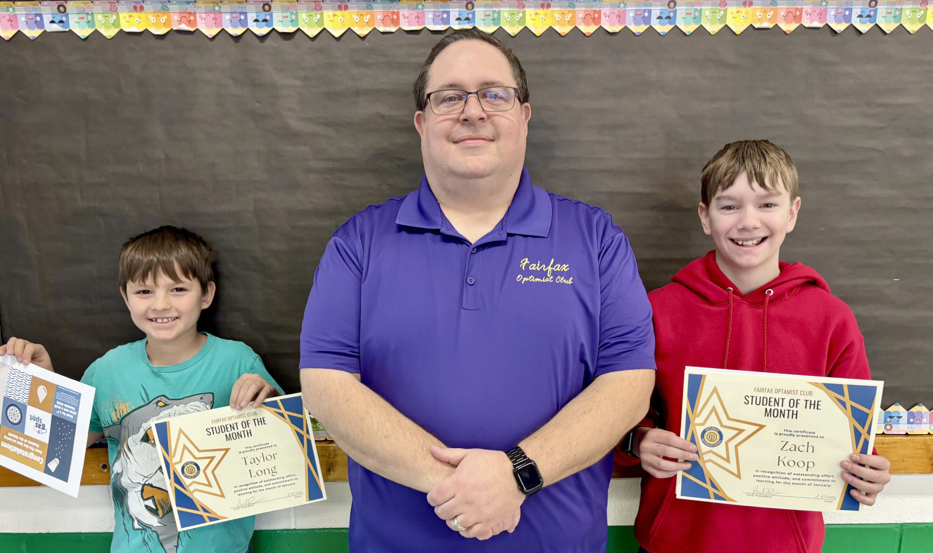 Brad Dush, middle, recently recognized Fairfax R-3 students Taylor Long, left, and Zach Koop, right, as Fairfax Optimist Club January Students of the Month. (Submitted photo)