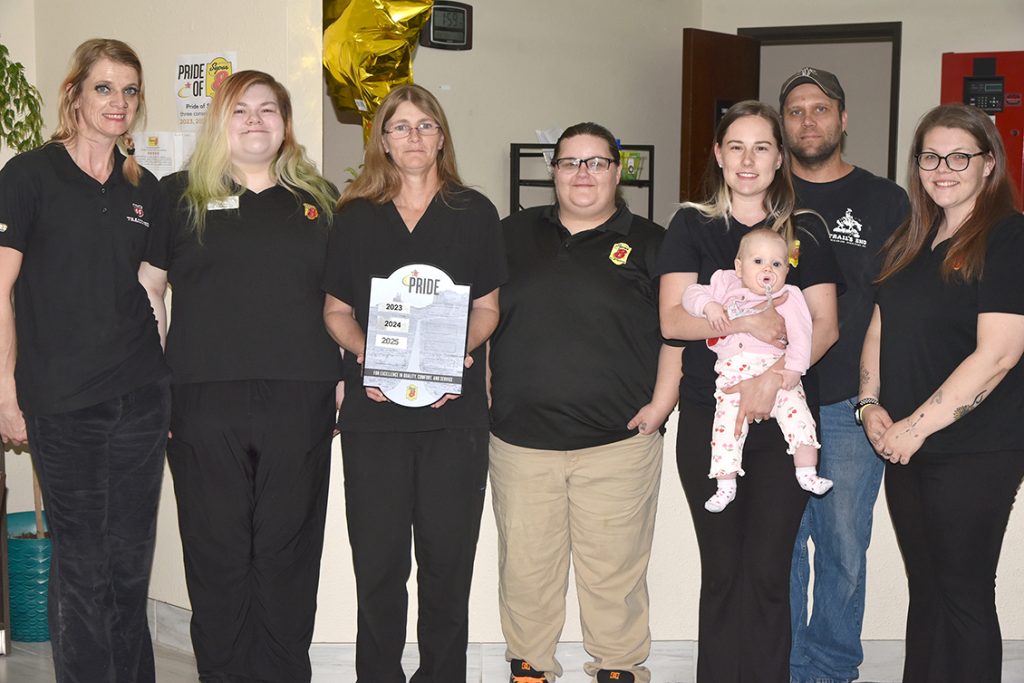 The Rock Port Super 8 was named the Best of Super 8 for the third consecutive year. Pictured celebrating the honor are Kelly Phillips, Joy Young, Michele Barnhart, Amber Herbst, General Manager Samona Pankau (holding daughter Maeve), Justin Pankau, and Alisha Corbin. Not pictured are Cassandra Hegstrom, Cody Archer, Diane & Ray Neeman, Andre Parker, Michael Lindahl, Linda Boden, and Tom Haskell.
