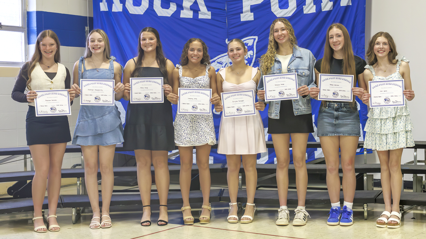 Members of the Rock Port High School Dance Team were recognized for their participation this school year. Dancers, from left to right, were: Raylynn Jenkins, Kinleigh Daugherty, Keira Roup, Landrey Kelly, Brylea Shrader, Braylyn Wood, Reese Herron, and Ellie Garst. Not pictured are Jacoby Driskell, Isabella Kroeger, and Claire Miller.