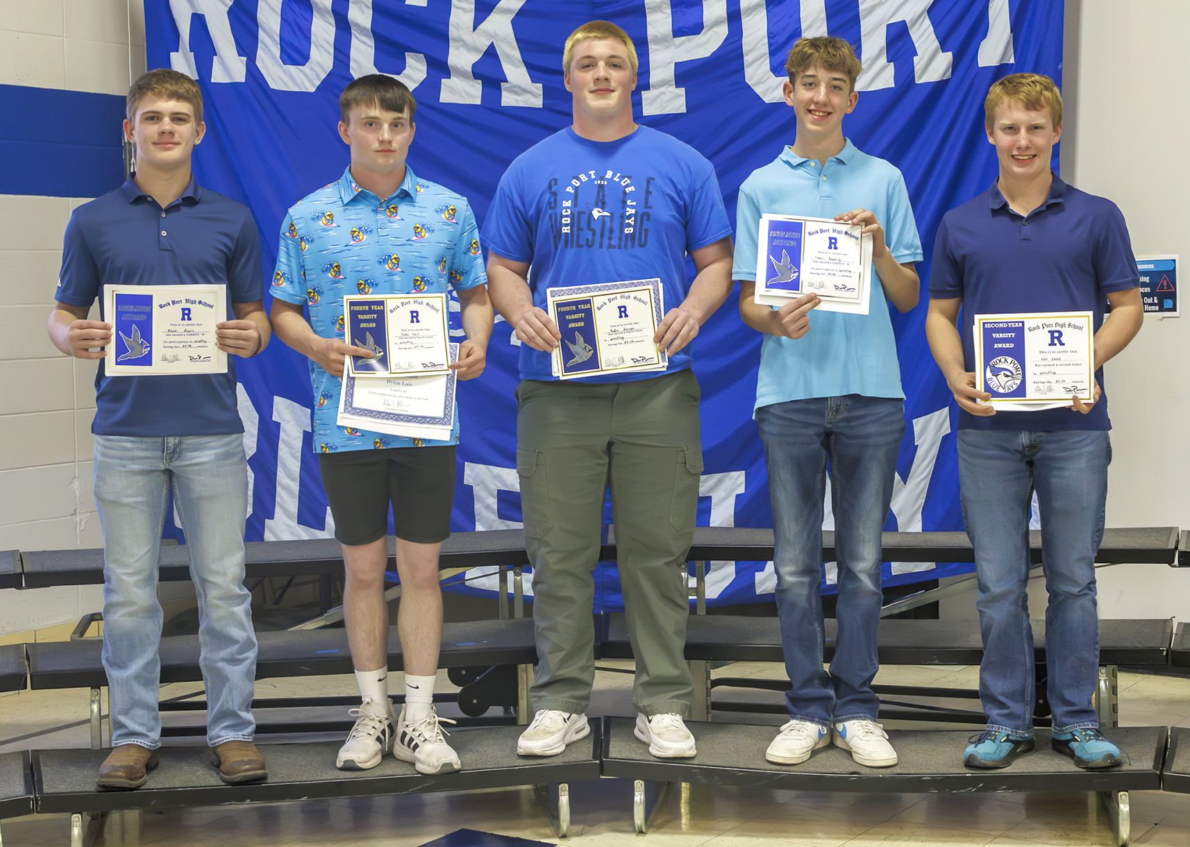 The Rock Port High School Boys’ Wrestling Team members received recognition for their 2025-26 accomplishments. Wrestlers, from left to right, were: Blaise Krogen, Dylan Lair, Ryder Herron, Cooper Daughterty, and Levi Lucas. Not pictured are Desmond Chaney, Chance Hayes, and Aidan Smyser.