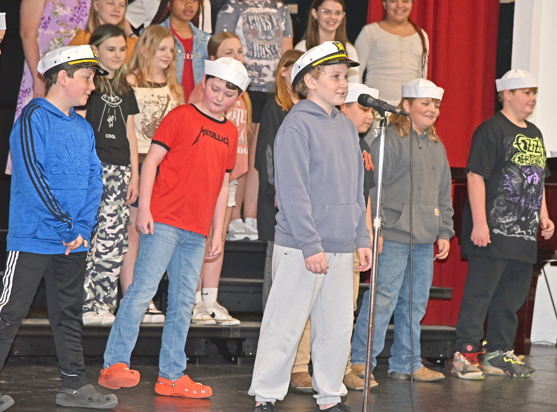 The boys in sailor hats, including Asher Stepp at the microphone, explained how the term “rock and roll” originated – from 17th-century maritime slang describing a ship’s motion, later evolving in African American music to describe religious fervor and, by the 1950s, to label the emerging rhythm and blues genre.