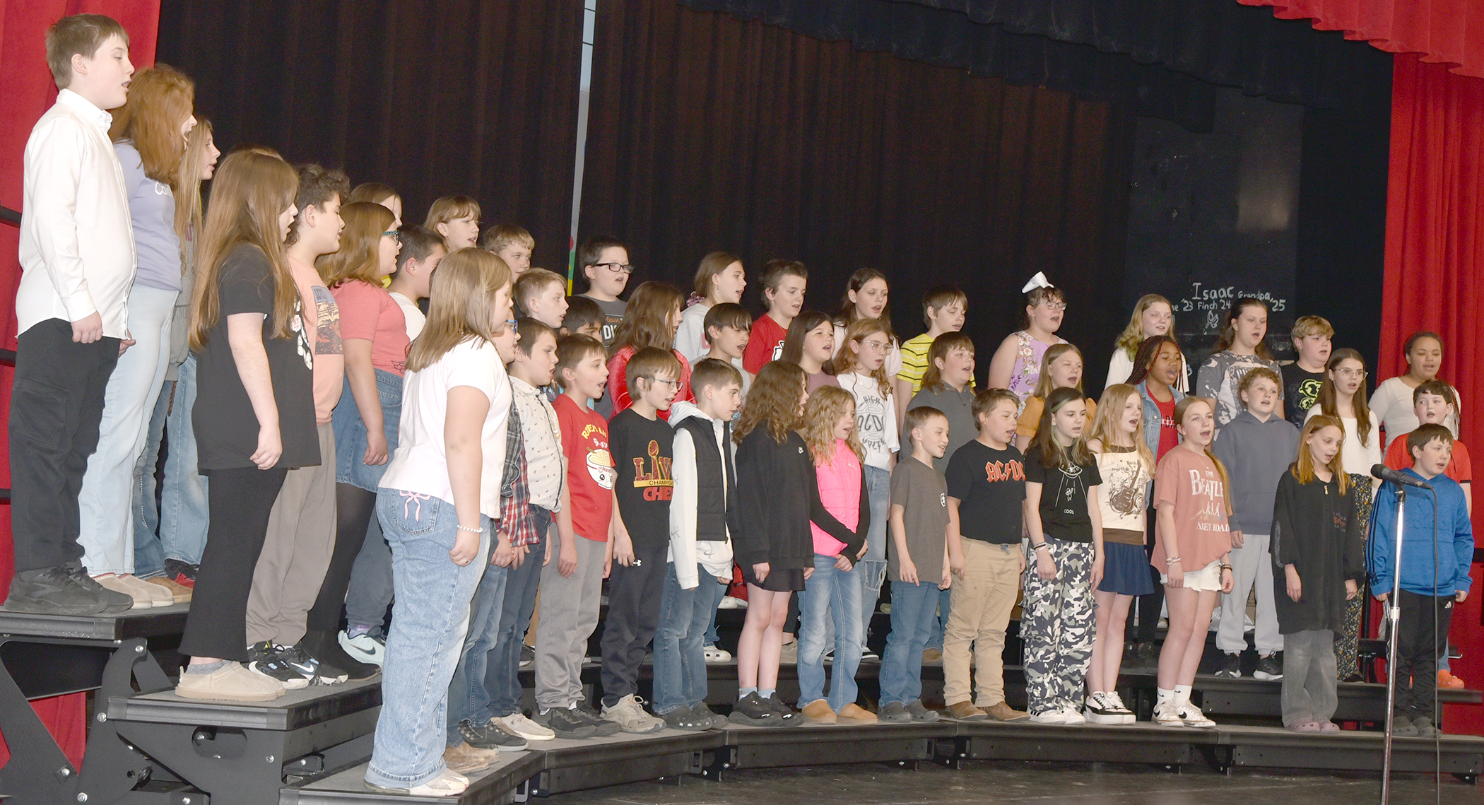 Fourth grade singers included Nola Bruce, Dakota Buchanan, Aiden Childers, Rylynn Comstock, Lyzzy Driskell, Haven Hogue, Damon Lambert, Cohen Lundquist, Zaiden Miller, Zoey Romines, Everett Scott, Ollie Shaw, Sage Sundermann, Marin Carson-Moreno, Izabella Childers, TayLynne Corbin, Brecklynn Lopez, Isaac Martin, Henry McCoy, Emalyn Miller, Luna Neeman, Kinslee Ohnmacht, Bennett Peregrine, Giovani Perez, Simon Piveral, Skylar Sportsman, Emmeline Vette, Kash Wheeler, and Jacob Wills.