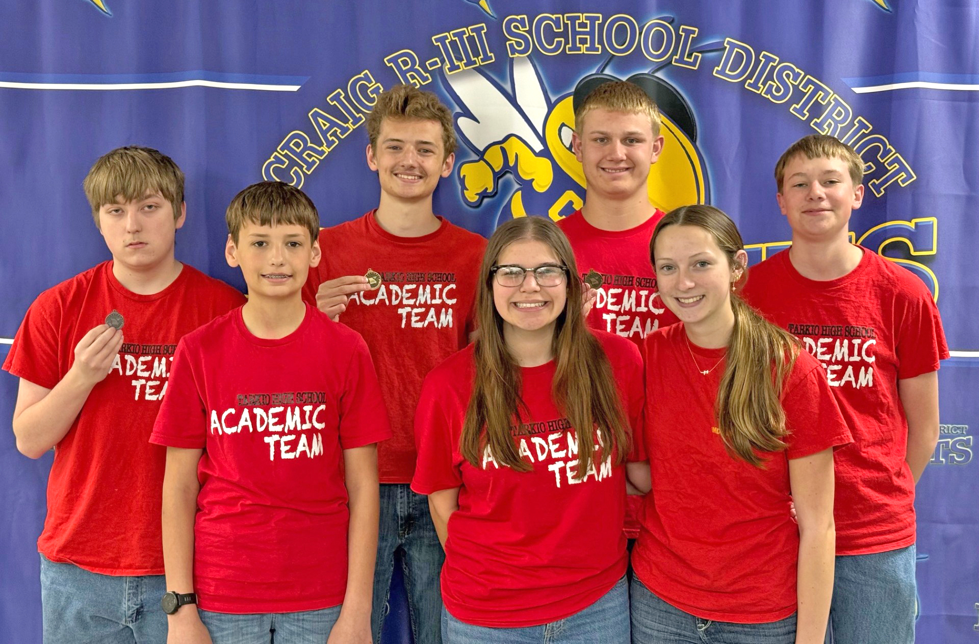 The Tarkio High School Scholar Bowl Team competed in the 275 Conference Tournament in Craig, Missouri, April 1, 2026. The team placed 4th overall out of eight teams. Pictured are team members, from left to right: front row – Owen Vette, Olivia Schaefer, and Danika Agnew; and back row – Dalton Hogue, Isaac Vette, Finn Hurst, and Ben Rolf. Finn, Isaac, and Dalton also earned All-Conference honors. (Casey Martin photo)
