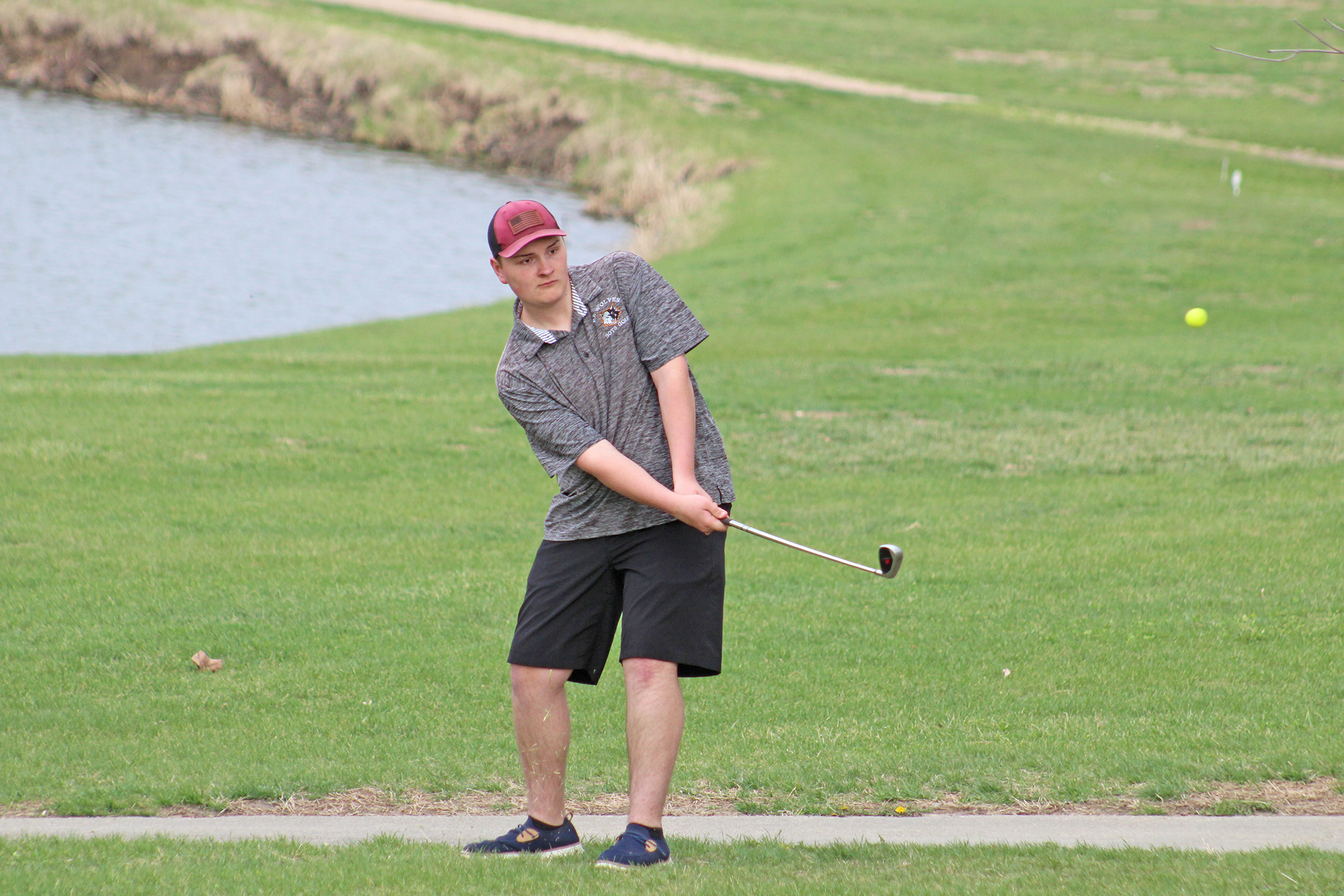 Finn Hurst tees off on hole number 5 at the Tarkio Golf Course April 8. He golfed a 55 in JV Wolf action.
