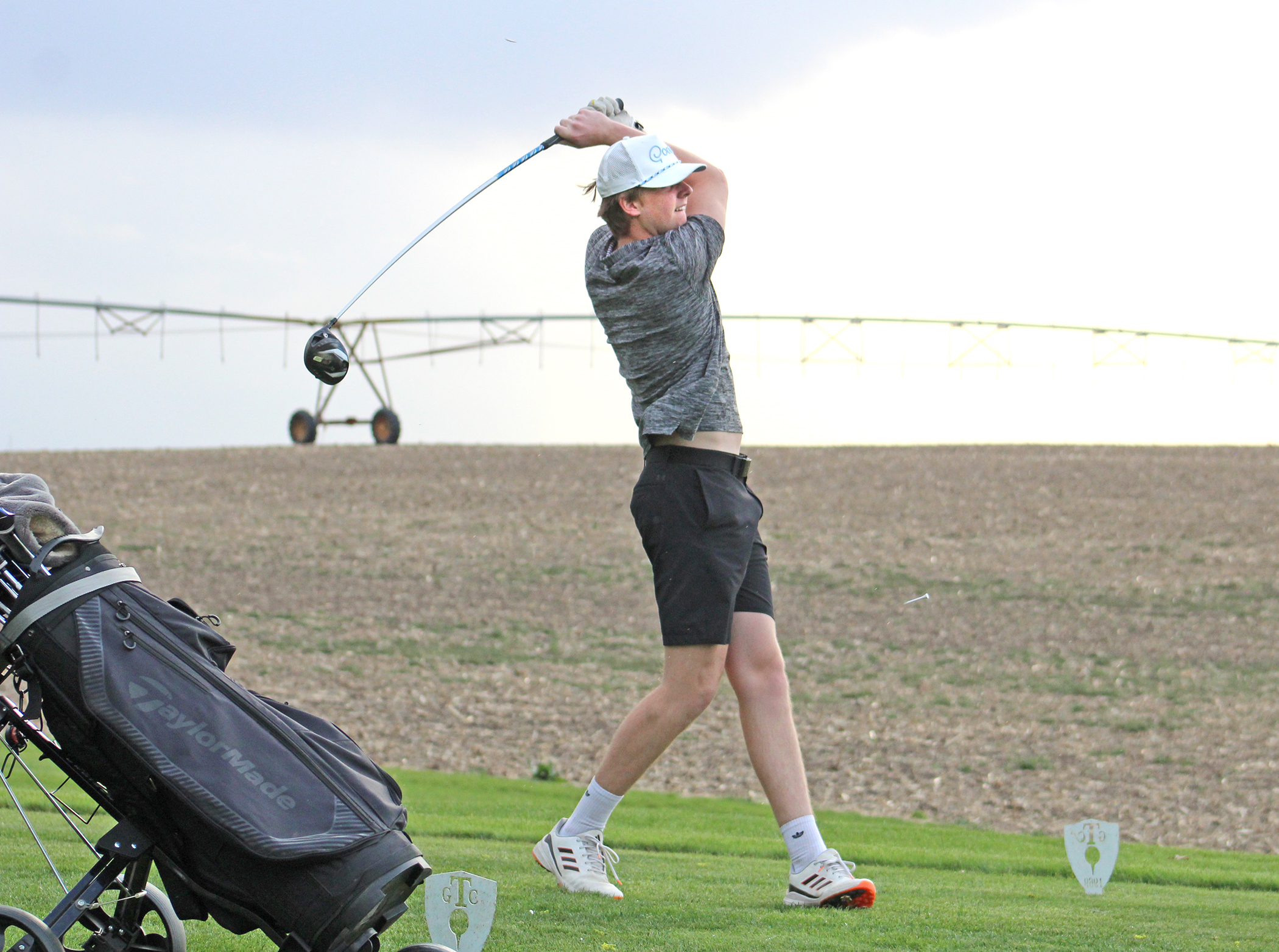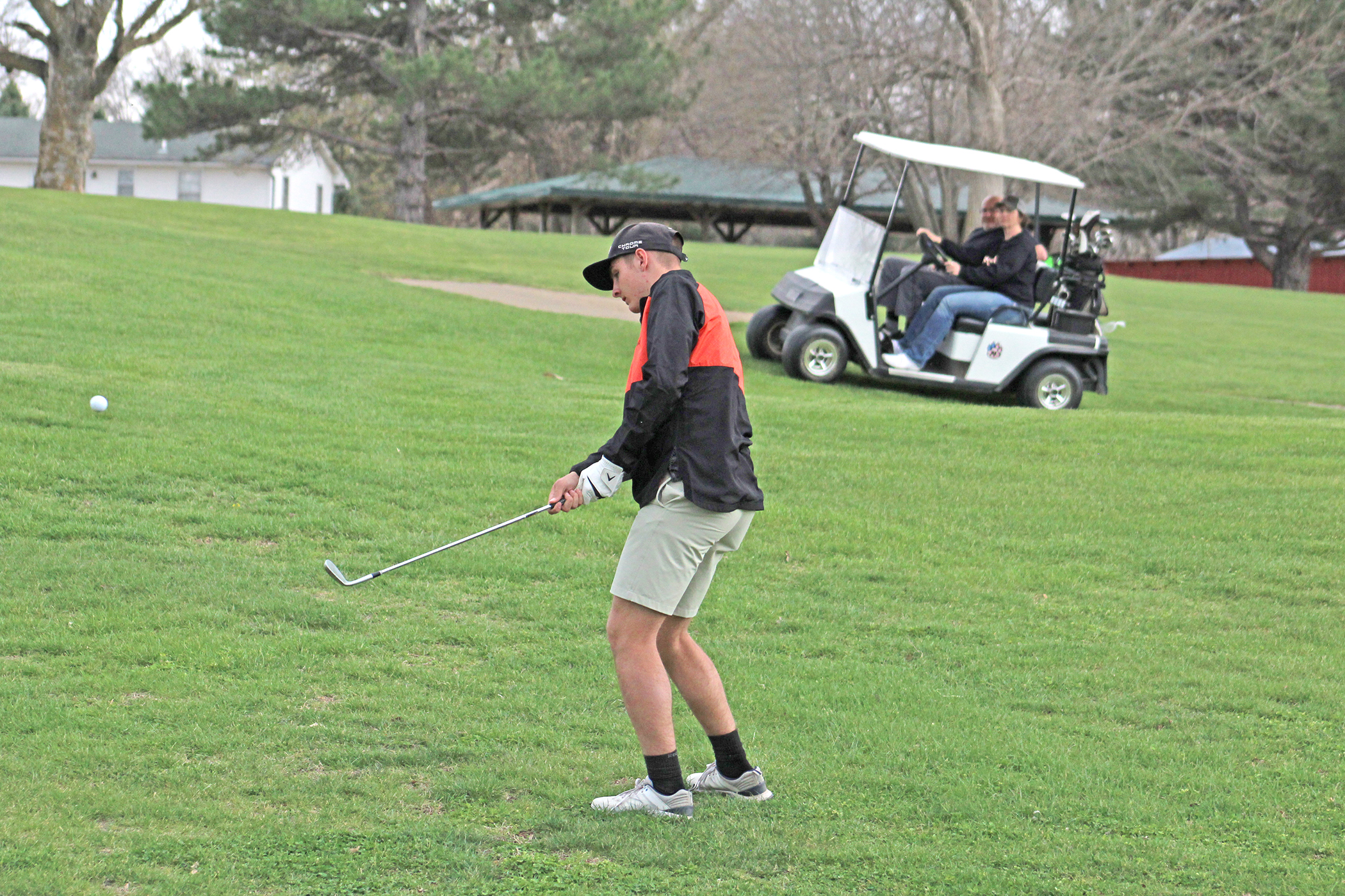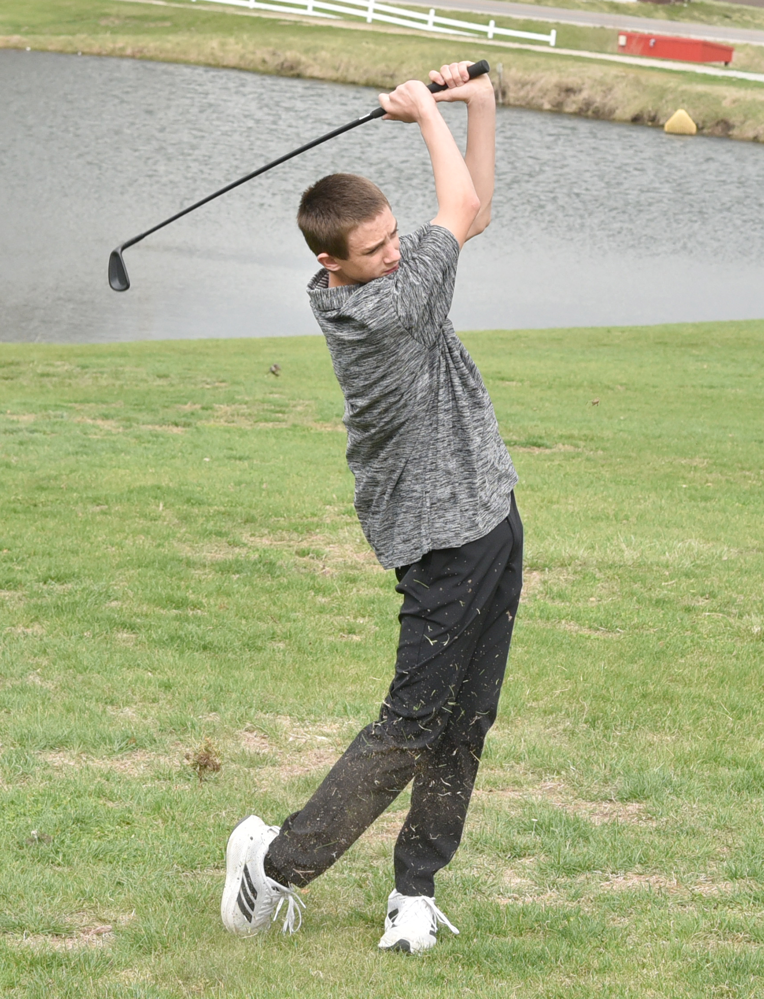 Mason Kingery tees off on hole number 2 at the Tarkio Golf Course in the Wolves’ first home event of the season. He scored a 52.