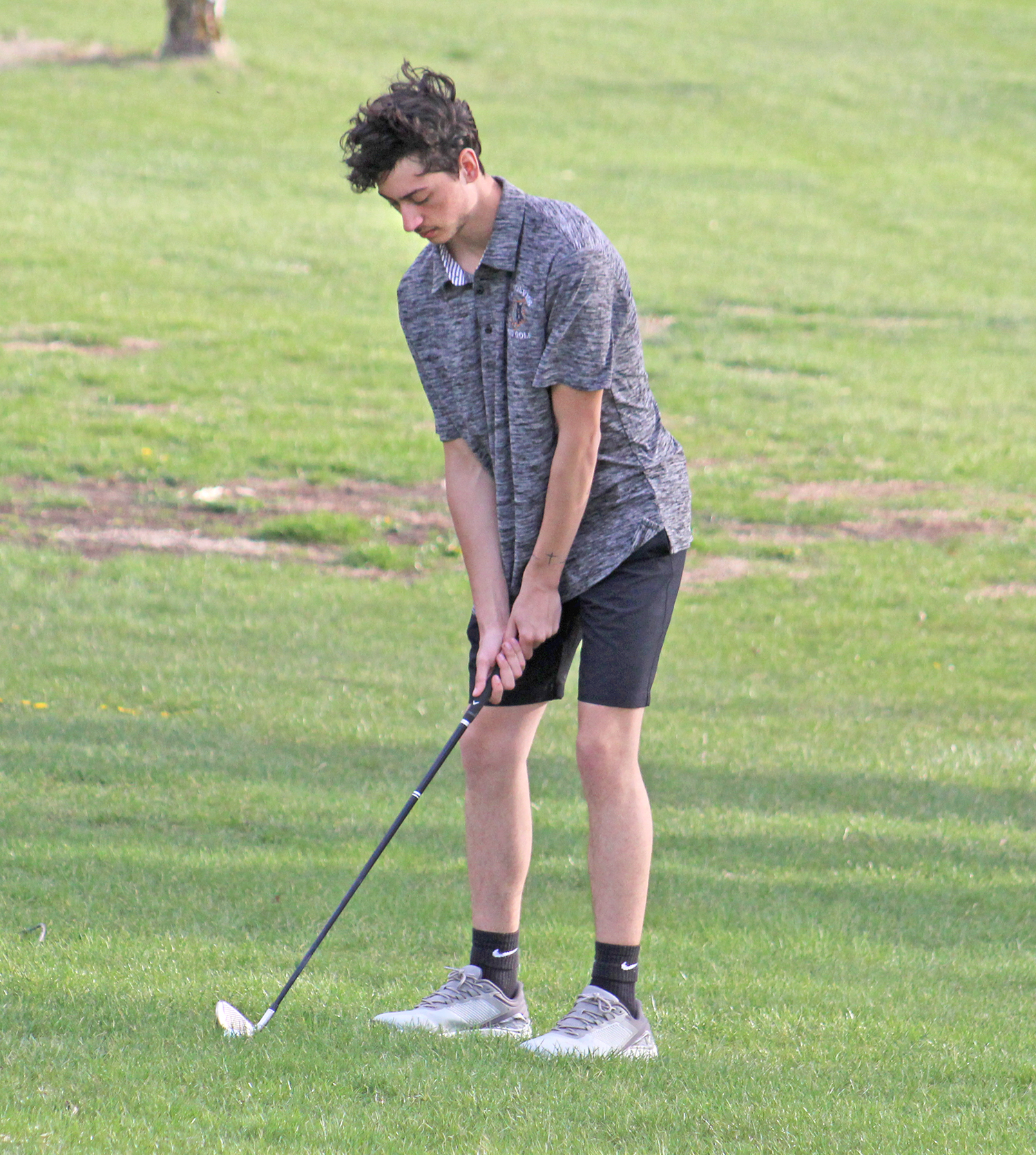 Noah McCoy sets up his shot on hole number 2 in the quad meet April 8. He scored a 61.