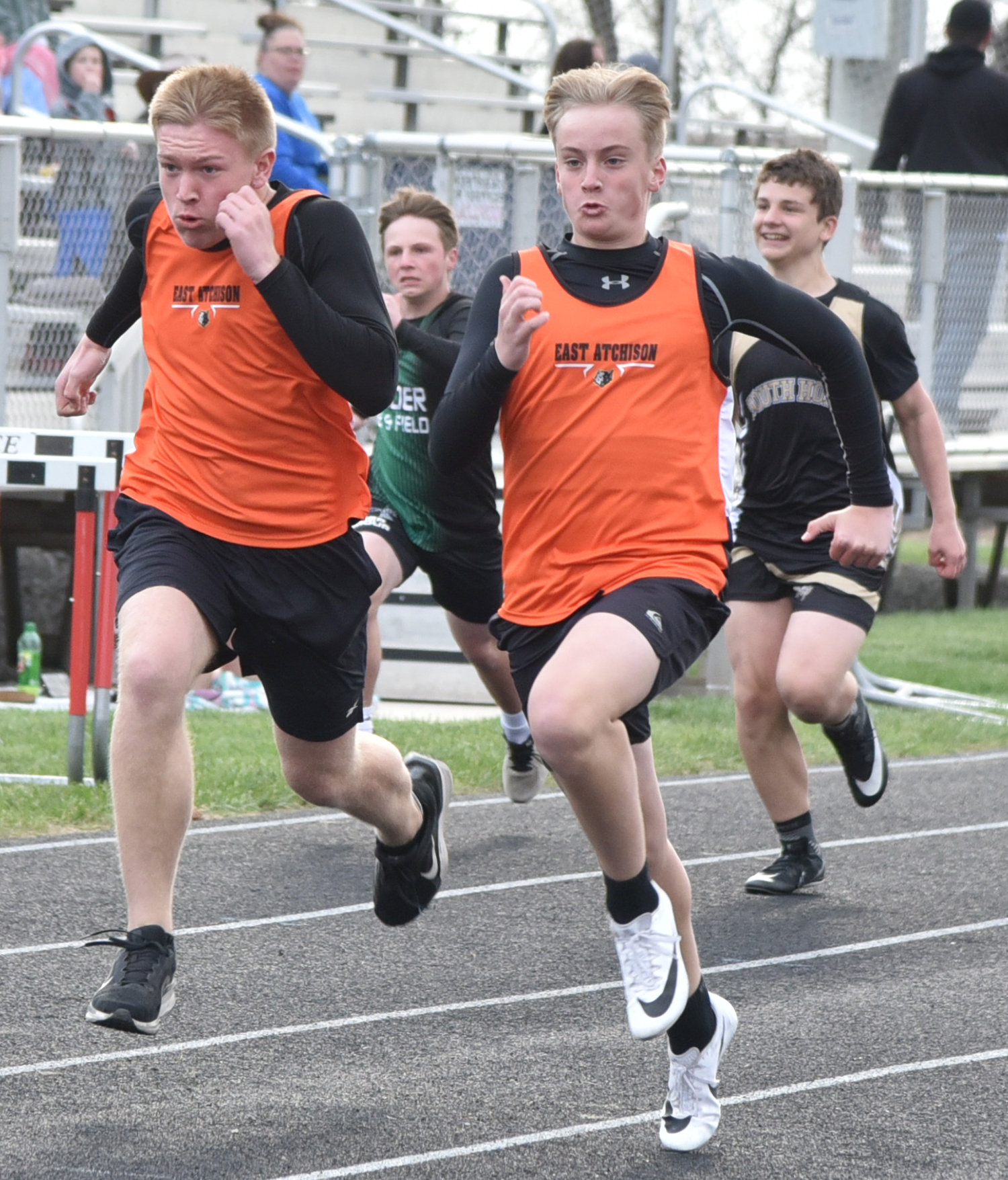 East Atchison runners Tucker Hurst, left, and Bryar Wennihan, right, sprint down the track in the 100 Meter Dash to place 4th and 1st respectively.